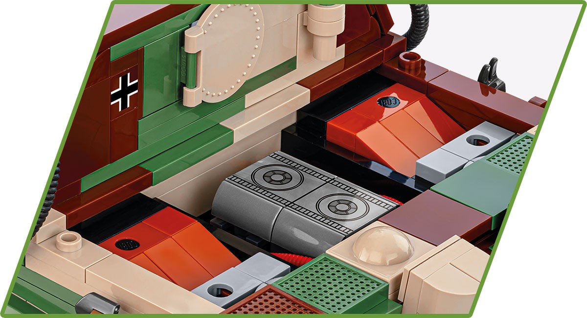 The block STURMTIGER was designed in a scale of 1:28 and consists of 1,100 high-quality elements. When built the vehicle measures 23cm in length and contains a lot of eye-catching details. The blocks have durable prints showing markings and characteristic details of the vehicle. The Sturmtiger also includes interior elements and a removable brick engine. The mini-engine model can be placed in the vehicle under the service hatch or displayed next to the model. The mortar barrel and wheels are also movable. You can move the vehicle on beautifully working tracks, as well. The set includes four mortar shells. There is also a crane mounted on the vehicle that allows it to lift missiles. Just for this set we have designed a new element that faithfully reflects the shape of the Sturmtiger barrel! Additionally, the set includes a figure of a mechanic working with an armored gun. A detailed and very large model of a heavy mortar is a must-have for collectors and history enthusiasts. Build history, piece by piece, with COBI!