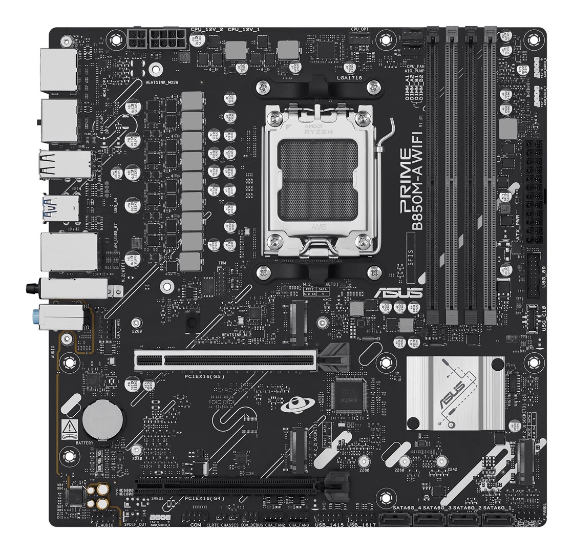 Η μητρική κάρτα Asus PRIME B850M-A WIFI, τύπου Micro ATX, προσφέρει μία ισχυρή βάση για την κατασκευή του υπολογιστή σας. Είναι συμβατή με επεξεργαστές AMD AM5, ειδικά μοντέλων Ryzen, και υποστηρίζει την τελευταία γενιά Zen 5, εξασφαλίζοντας επιδόσεις για απαιτητικές εργασίες και παιχνίδια.