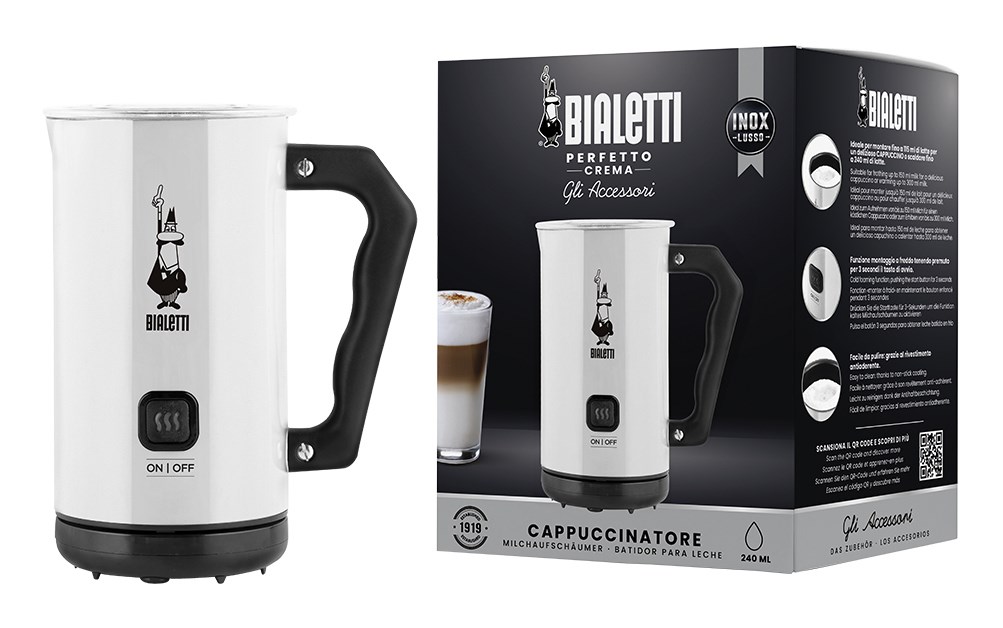 Με τον ηλεκτρικό αφρογαλιέρα γάλακτος της Bialetti σε λευκό χρώμα, μπορείτε να ετοιμάσετε μέσα σε λίγα δευτερόλεπτα πλούσιο και βελούδινο αφρόγαλα, ιδανικό για Cappuccino ή Latte Macchiato. Η συσκευή είναι κατασκευασμένη από αλουμίνιο και διαθέτει δύο διαφορετικά εξαρτήματα: ένα για αφρόγαλα και ένα για θέρμανση γάλακτος.