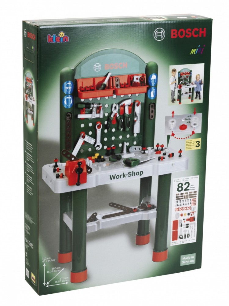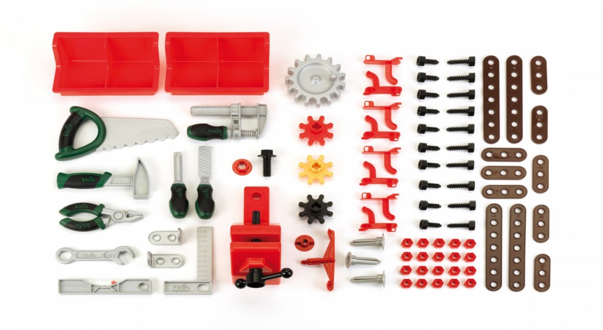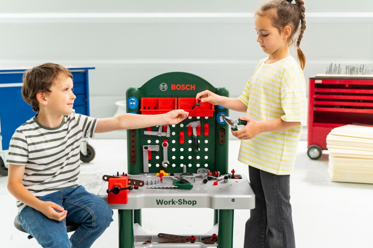 The fully equipped children's workbench is manufactured in Germany under Bosch license. The worktop offers numerous educational functions, a vice and practical storage compartments and 3 storage containers. On the back wall of the craft bench and on the shelf under the worktop there is space for high-quality accessories, some of which can be hung on the wall using practical hooks: flat and Phillips screwdriver, wrench, spirit level, pliers and file, hammer, saw, square and much more. Children quickly and playfully learn how to use strips, screws, nuts and screw elements of different sizes and shapes.