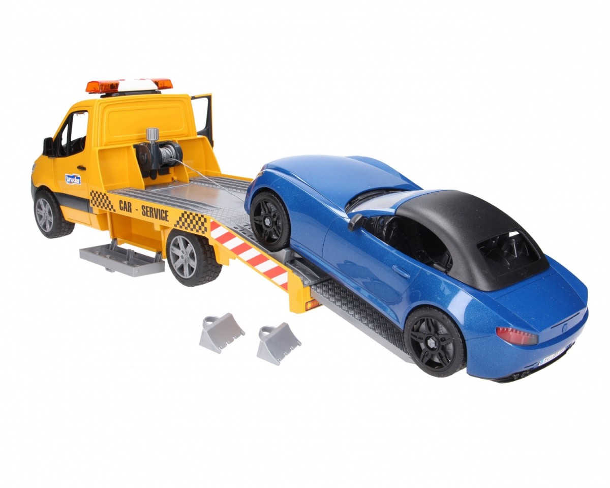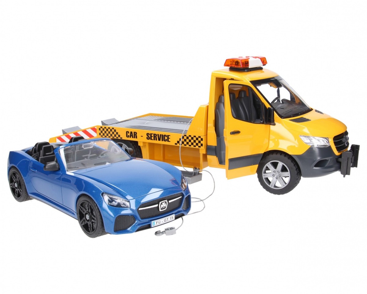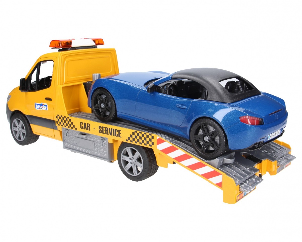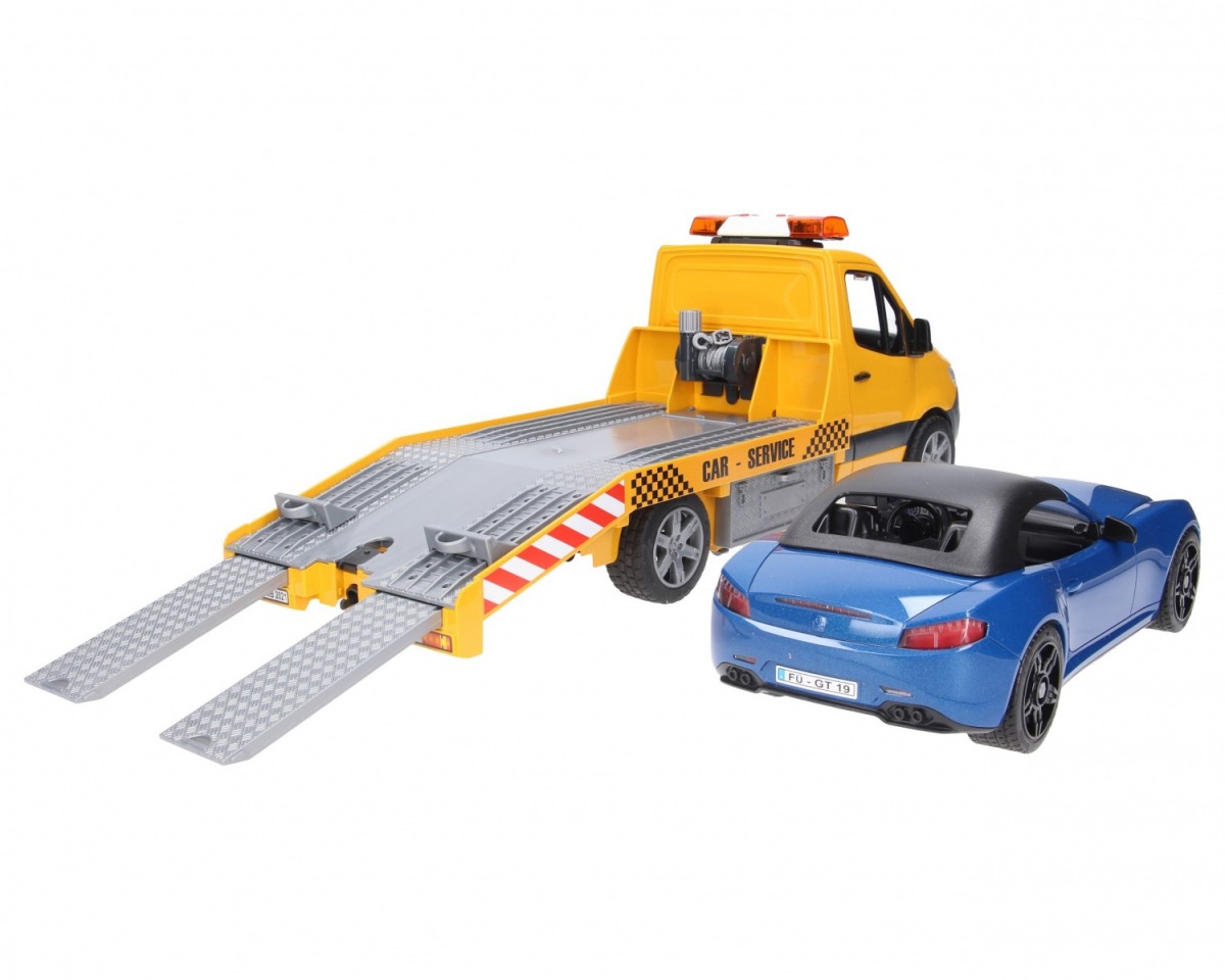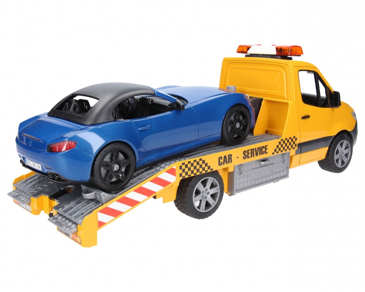 The chic and modern design of the new Sprinter catches the eye at first sight. The car transporter has a platform that is modelled in the finest detail on the original. The vehicle transporter is equipped with a light and sound module as well as a rope winch. With this winch, vehicles can be freed from even the most difficult situations. Toolboxes attached to the side are used to store wheel chocks, and the ramps can also be slid directly into the chassis. The included BRUDER Roadster has a removable roof and offers space for any bworld figure. For even more fun, the vehicle has a new wheel changing system installed. The toy fits perfectly with the Bruder car workshop (no. 62110).