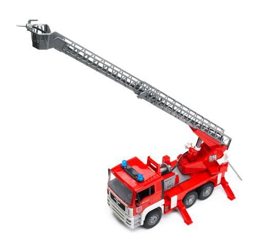 Car MAN TGA Fire engine with ladder, water pomp Main features: Rubber, soft, profiled tread Raised driver's cab Three axle suspension The possibility of pouring water and actual pumping with a rubber hose The ladder is raised and extended 80 cm extendable ladder Drum hose Work supports Light and sound module (02801) Side mirrors Part number: BR-02771 Minimum age: 4 Lenght: 4 Width: 1 Height: 2 Security: Not suitable for children under 36 months. Choking hazard due to small, easy-to-swallow parts. Used batteries must be disposed of immediately. New and used batteries should be kept out of reach of children. If you suspect that batteries have been swallowed or inserted into the body, contact a doctor immediately.