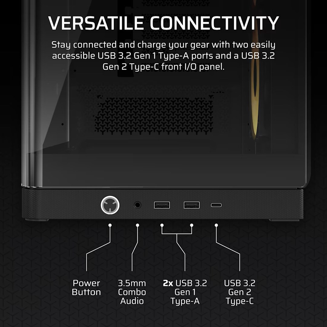 Easy access to modern ports, including one USB 3.2 Gen 2 Type-C, two USB 3.2 Gen 1 Type-A ports, and integrated 3.5 mm audio/microphone jacks.