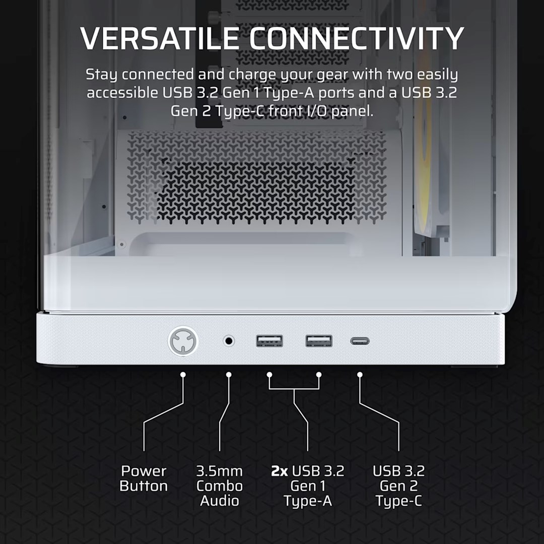 Provides easy access to modern ports, including one USB 3.2 Gen 2 Type-C, two USB 3.2 Gen 1 Type-A ports, and integrated audio and microphone jacks.