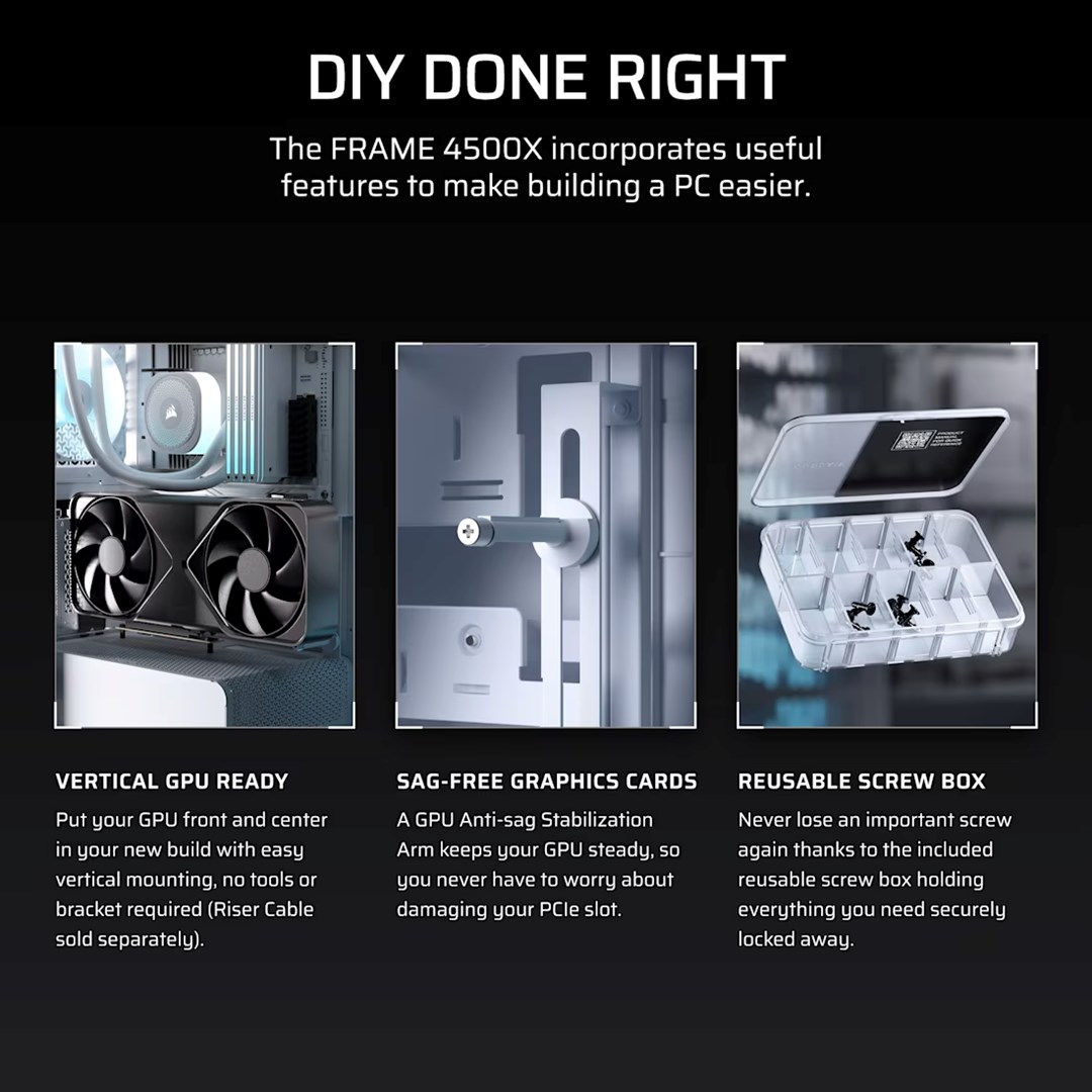 PANORAMIC GLASS SIDE PANEL A single piece of curved tempered glass allows unobstructed display of your build, with no seams or sharp edges blocking the view. The curved glass wraps around the front and side of the case, providing a clear view of your components. The tempered glass side panel is laminated with an almost invisible safety film that also reduces noise. CORSAIR INFINIRAIL FAN MOUNTING SYSTEM This multi-point steel fan mounting system offers unmatched flexibility for top-mounted fans. Simply slide the rail to install 120 mm or 140 mm fans exactly where needed, providing targeted airflow without the limitations of fixed mounting. RS-R REVERSE-BLADE FANS INCLUDED The included RS-R ARGB PWM intake fans with reverse blades provide unobstructed RGB lighting and quiet cooling. Fresh air is drawn in through the ventilated side into the spacious mid-tower, delivering effective cooling and high airflow for maximum performance. VENTILATED SIDE AND TOP PANELS Optimized for airflow, the top and side panels maximize ventilation for fans mounted in both locations. Side-mounted intake fans draw cool air from outside the case, while top-mounted fans (sold separately) exhaust hot air to maintain a cool interior. CABLE-FREE DESIGN Compatible with ASUS BTF, MSI Project Zero, and GIGABYTE Project Stealth motherboards, with numerous cable cutouts and mounts to keep cables organized, even in hidden areas. DIY-FRIENDLY FEATURES The FRAME 4500X includes practical features to simplify PC building: