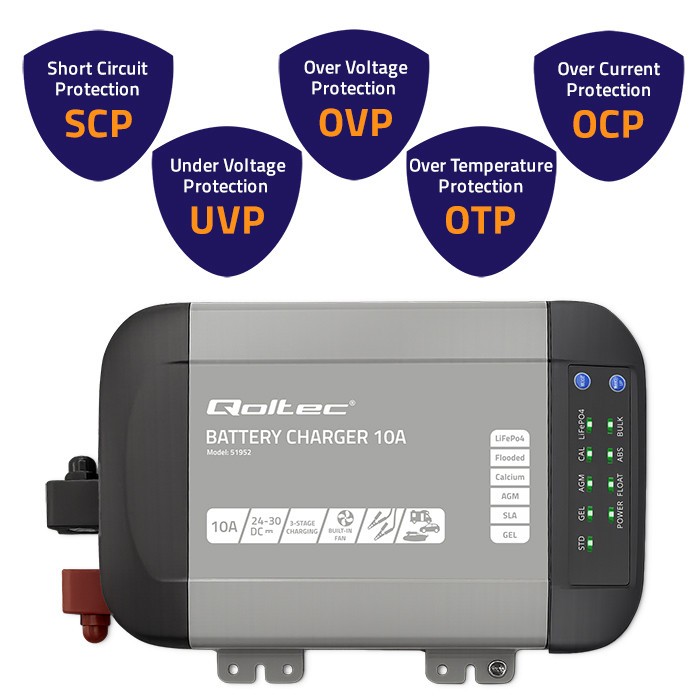 – Features short-circuit, reverse polarity, overcharging and overheating protection,