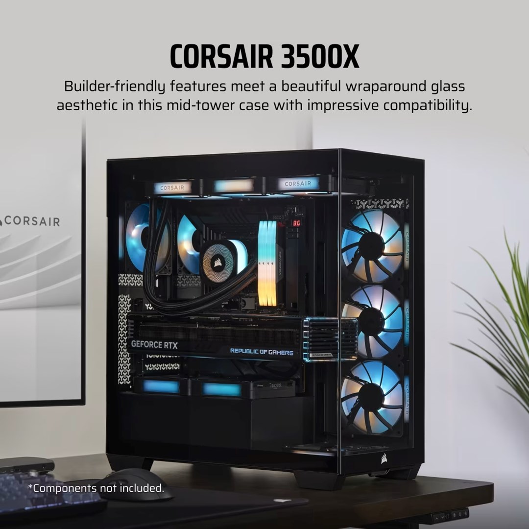 Description Mid-Tower PC Case 3500X LX-R RGB iCUE Link Build Without Limits You dont need a huge case to build a powerful PC. The 3500X accommodates most large graphics cards, CPU coolers, 360mm radiators, and even E-ATX motherboards-all without taking over your entire desk. Build Better. Build Smarter. Transform the way you build your PC with breakthrough single-cable technology that automatically detects and configures fans, CPU cooling, and other internal components. Includes High-Performance iCUE LINK LX120-R RGB Fans Three LX120-R RGB fans with reversed blades and the iCUE LINK system hub allow you to leverage a revolutionary ecosystem that simplifies PC building. These fans undergo months of rigorous testing to deliver power and efficient airflow, keeping your system performing at its best. Cooling Performance Effective cooling is essential for modern PCs. The 3500X case supports fan installation on the sides, top, and near the PSU, so you can optimize airflow for every component. Additionally, mounting points for 360mm radiators on the top and side allow for liquid cooling setups. Simple Design The modern design of the popular 3500X case format features convenient solutions that make building and maintaining your PC easier. Multiple Cooling Options Create a cooling system tailored to your needs with space for up to ten 120mm fans and multiple radiator mounting options, supporting radiators up to 360mm on the top and side. Modern Front I/O Panel Provides easy access to modern ports, including a USB 3.2 Gen 2 Type-C port, two USB 3.2 Gen 1 Type-A ports, and integrated audio and microphone jacks.
