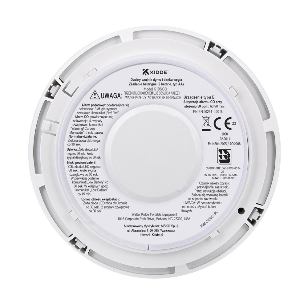 Special functions: Patented Kidde electrochemical sensor for carbon monoxide detection High-quality Kidde optical sensor designed for fire hazard detection At least 40% longer operating time compared to most sensors available on the market Loud alarm and visual indication in the form of an electroluminescent LED Voice messages distinguishing the detected threat Test/Reset button for checking and operating the device Hush function to silence the audible fire alarm Battery-powered operation ensures protection even in the event of a power outage Special design allows for ceiling or wall mounting Security mechanism prevents accidental removal of the sensor Low battery indication Indication of incorrect operation and end of life Simple installation and operation Construction mark B National Certificate of Constancy of Performance confirming compliance with the Polish standard PN-EN 50291-1:2018+AC:2021 CNBOP-PIB certificate confirming compliance with the Polish standard PN-EN 50291-1:2018+AC:2021 standards Compliance with PN-EN 14604:2006 (EN14604:2005) standard confirmed by the independent, notified testing body TÜV Rheinland TÜV Rheinland certificate confirming compliance with the EN50291-1:2018 standard 10-year warranty