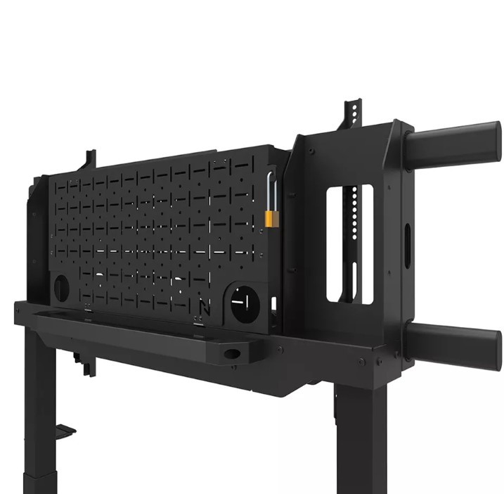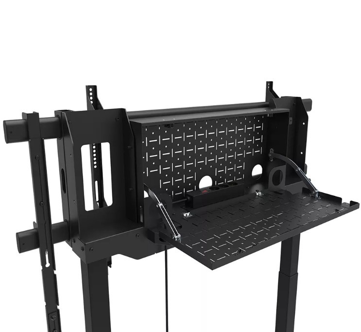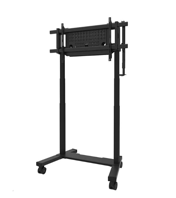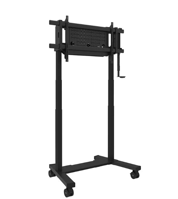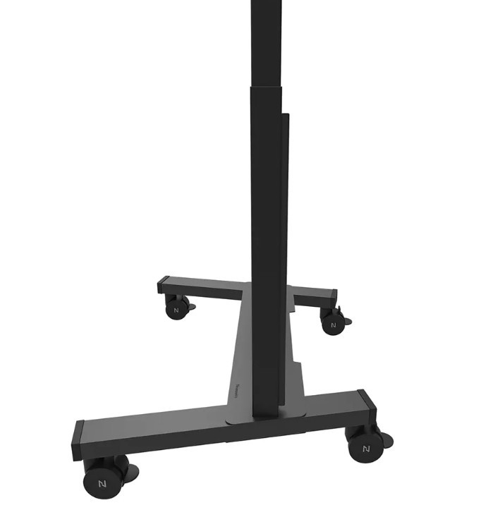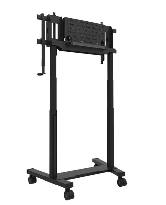 The Neomounts FL55-975BL1 MOVE Lift XL is the ideal motorized cart for large displays up to 115″ and 160 kg. The sturdy stand offers 65 cm of mechanical height adjustment, allowing for both seated and standing presentations at the ideal viewing height and raising the screen above the audience. Operation is smooth and precise thanks to the conveniently located control panel. An anti-collision system ensures safe height adjustment, and the handles can be locked with a padlock (not included) for added security. An optional ventilated, lockable equipment compartment with a cable outlet ensures clean and secure equipment storage.