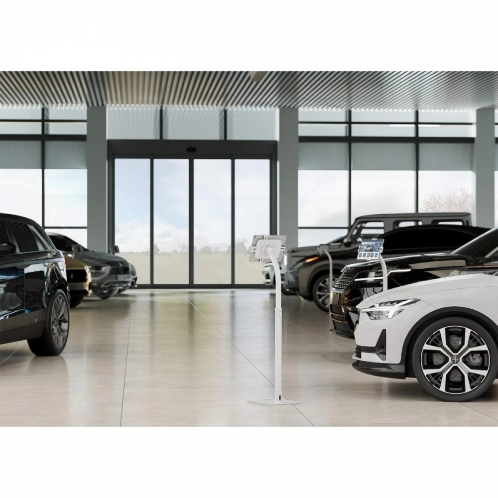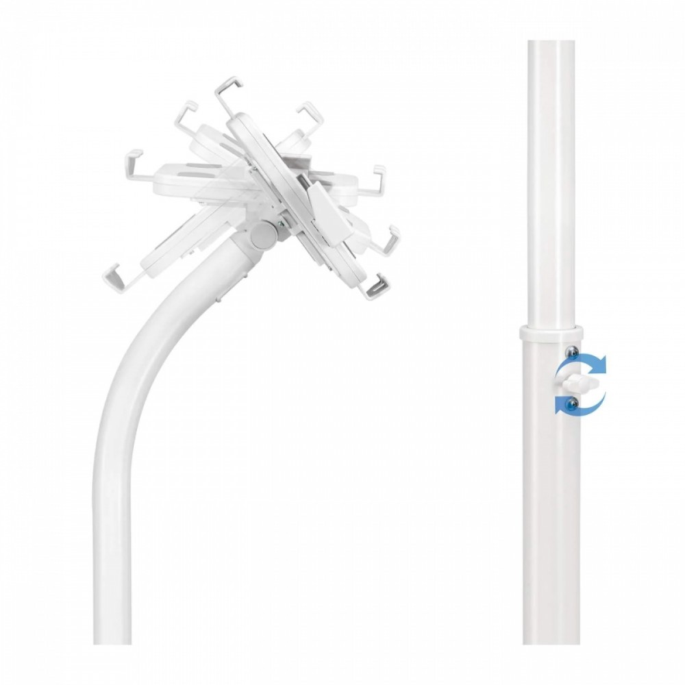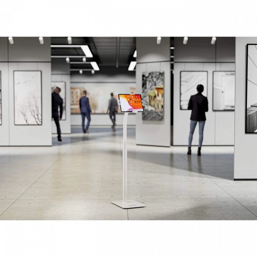 Lockable, height-adjustable floor holder for tablets from 7.9″ to 11″, 360° rotation, tilt from +20° to -110°, white