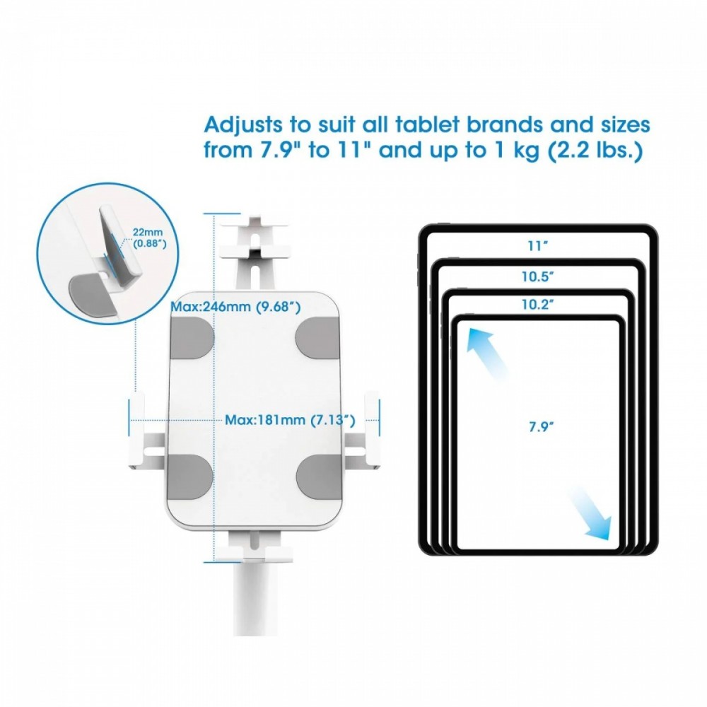 - The secure, anti-theft kiosk stand can be adapted to tablets of all brands and sizes from 7.9 to 11 inches and weighing up to 1 kg.