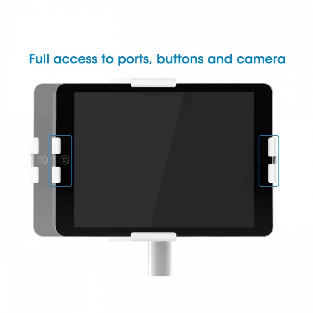 Adjustable holder clamps accommodate 7.9- to 11-inch tablets of any brand, providing access to ports, buttons and front/rear cameras. The soft back and included foam pads prevent your device from being scratched.