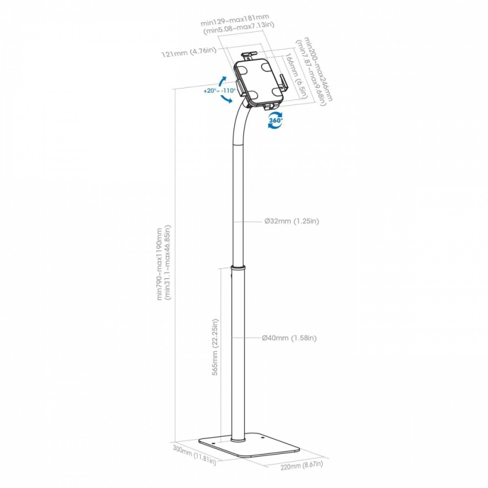 Dimensions: Pole dimensions (L x W x H): 40/32 x 40/32 x 790 to 1190 mm Base dimensions (L x W x H): 300 x 220 x 5 mm