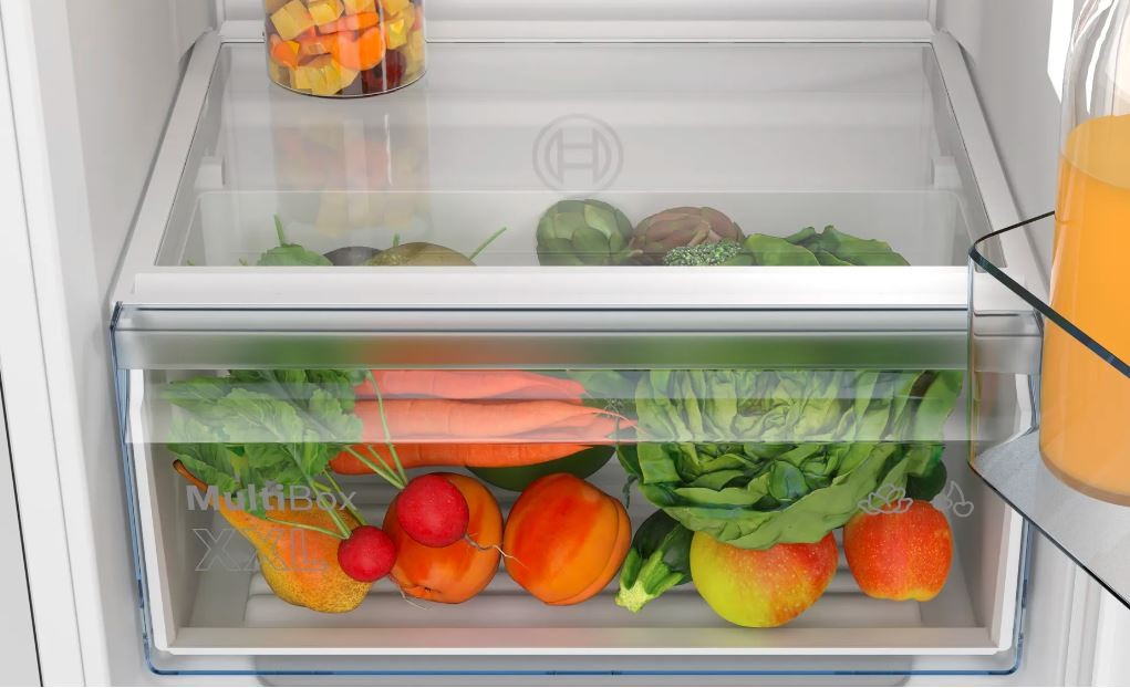 Description More space for your fresh produce. Storing fruit and vegetables has never been so easy. The MultiBox XXL offers plenty of space for your fresh food. Great when you want to fit an extra head of lettuce or chill a watermelon before the next hot day. Constant temperature for greater freshness. Uneven cooling in the fridge can significantly affect the taste and life of your produce. With Eco Airflow, humidity and temperature are evenly distributed throughout the cooling area, helping to preserve the taste and shelf life of everything inside your fridge for longer. LED lighting: see the contents of your refrigerator in a new light. The use of LEDs is a completely new lighting concept for the interior of your refrigerator, ensuring that the light is evenly distributed throughout. The long-lasting, energy-saving LEDs automatically illuminate the interior with brilliant white light and provide comfortably bright, uniform and glare-free interior lighting. LED lighting helps you keep an eye on everything in the fridge. A fridge that knows how to maintain the right temperature. Activating the Super Cooling function before shopping will lower the temperature for a short period of time so that fresh produce can be stored at the right temperature. The temperature can be lowered by pressing a button (to a maximum of 2°C). To prevent excessive energy consumption, the function switches off automatically after approximately 6 hours.
