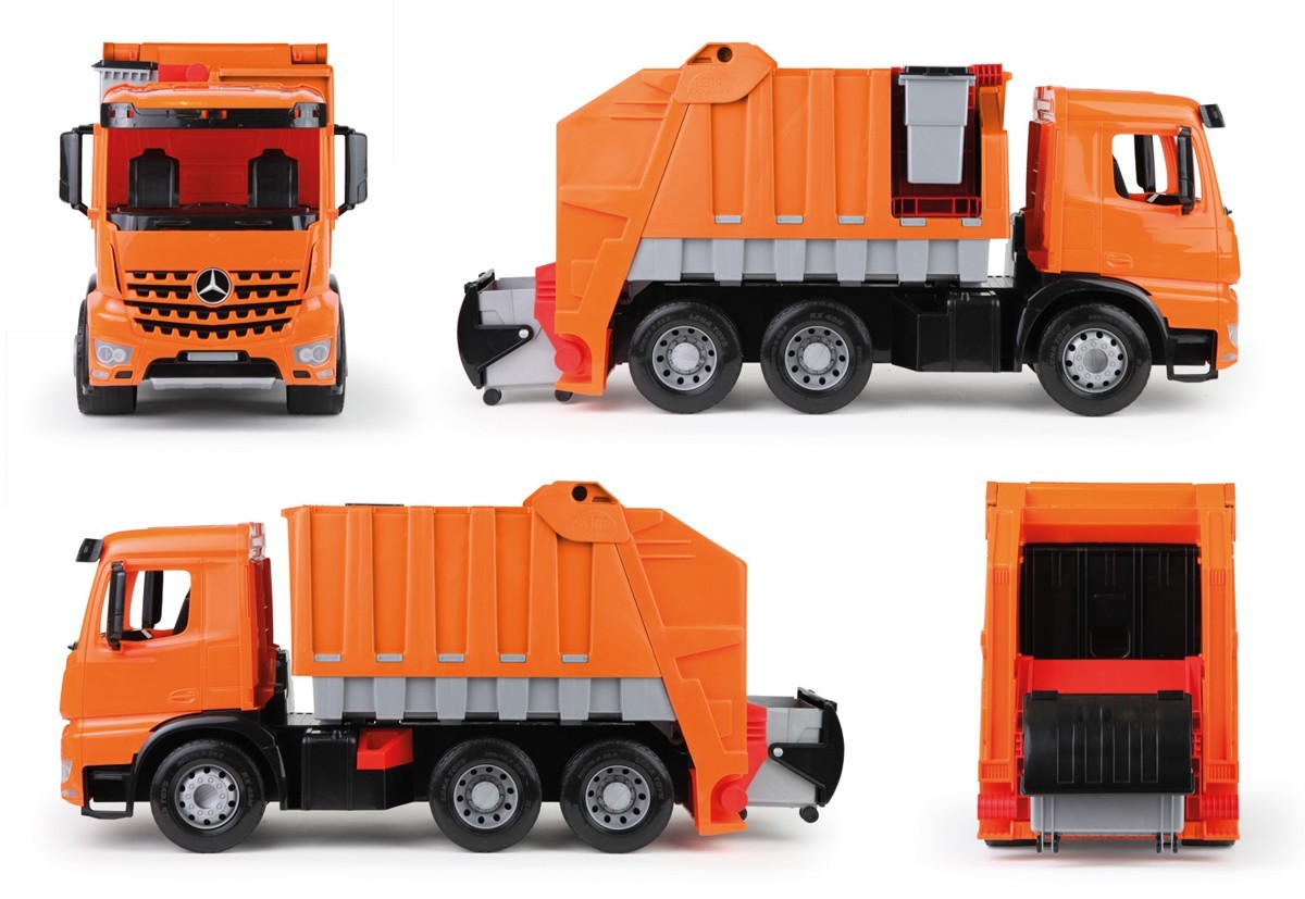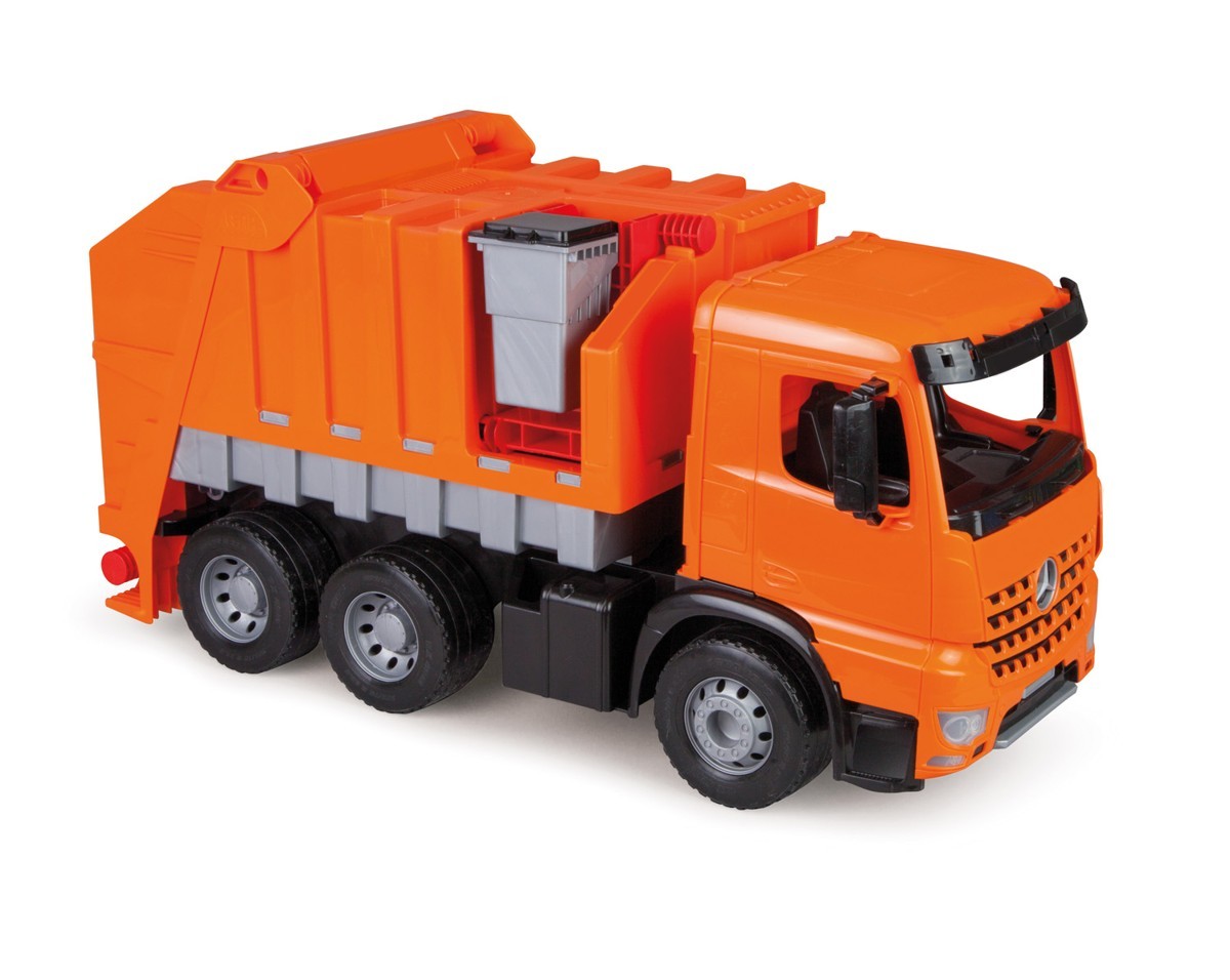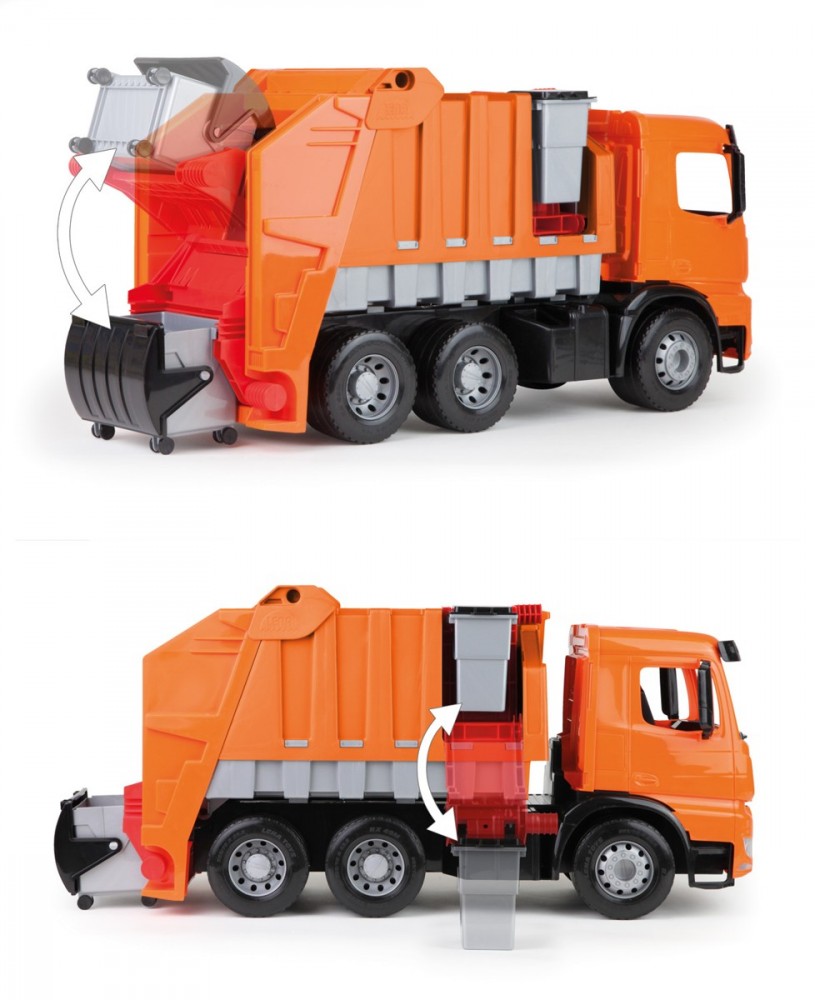 Garbage truck equipped with a raised container in the back and a trash can on the side of the vehicle. The flap of the container lifted up. Max static load of 100 kg. Part number: 02165 Minimum age: 3