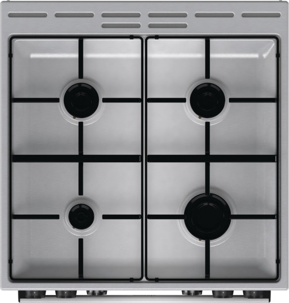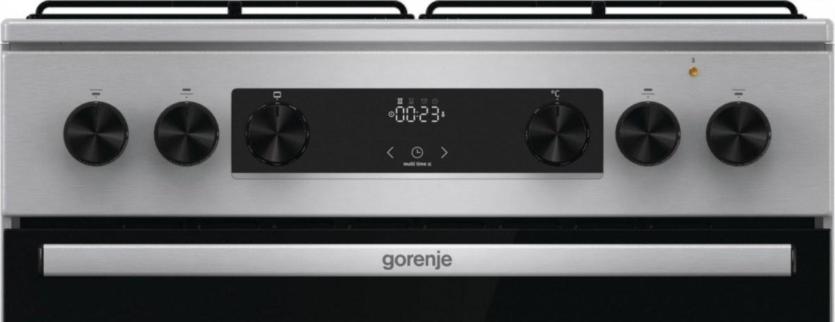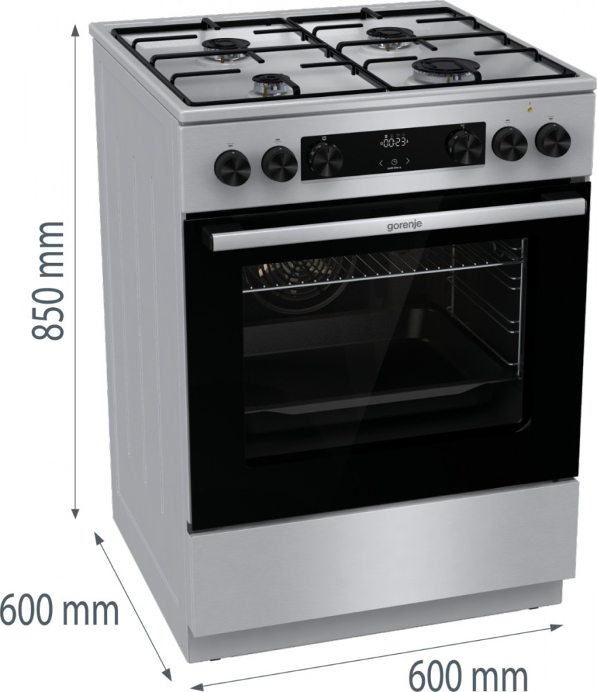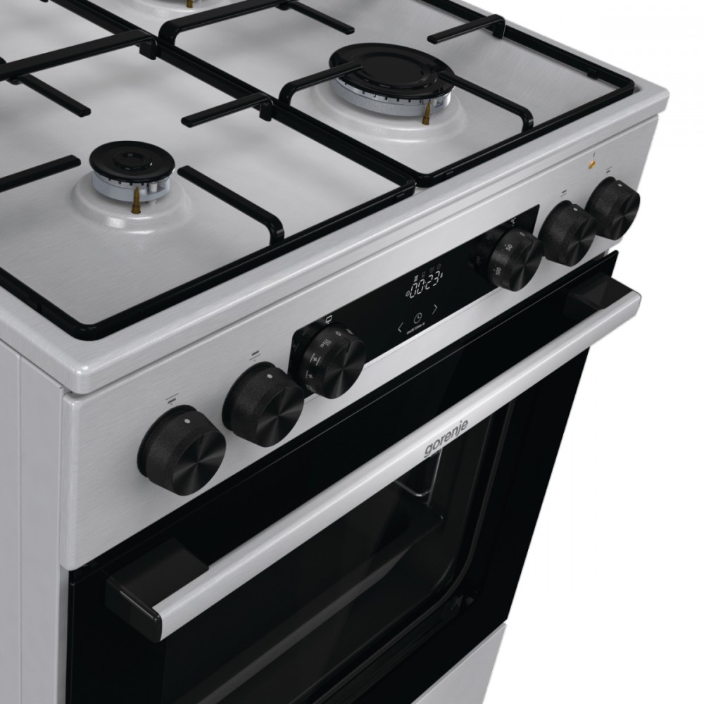 Description Gas-electric cooker GKS6C70XJ Pizza function The best pizza in town This program with a baking temperature setting of up to 275 is specially designed to help you bake the perfect pizza, focaccia, flatbread and similar baked delicacies. The fastest way to bake frozen treats This efficient baking program is a great choice for all frozen and ready meals. For healthy pleasure Now you can have crispy and tasty fried food without extra calories. This extremely intensive hot air baking method does not require the use of fat to ensure a perfectly delicious, crispy golden crust. Combined with a special perforated baking tray (depending on the model) that perfectly encloses the pan, you will achieve even better results. It is ideal for small pieces of meat, fish, vegetables and ready-made frozen foods such as fries and chicken nuggets. You will enjoy a wonderfully crispy golden crust of your favourite fried dishes, but without a drop of oil! The easy way to bake with steam This program creates a perfectly steamy environment that ensures your bread rises beautifully and has a crispy crust. All you have to do is pour some water into a shallow tray, select the ExtraSteam program and let the oven do the work. Evenly baked every time Gorenje ovens are well known for their innovative, rounded cavity, which has been a hallmark of theirs for many years. The HomeMade shape was inspired by traditional wood-burning ovens and provides better air circulation than its competitors. Now the HomeMade shape has been completely refreshed and airflow has been improved thanks to a new heating element design and better positioning of the ventilation holes. That's why the temperature is stable throughout the oven. Never again will your food be burnt on one side and undercooked on the other. Perfect from every side MultiAir technology guarantees optimal heat circulation inside the oven. Thanks to the cleverly positioned ventilation holes on the rear wall and the unique, rounded shape, the air is evenly distributed throughout the oven. The fan pushes hot air around the entire volume of the oven, so that food is perfectly baked on every side. The dynamic air movement also allows simultaneous baking on multiple levels without mixing odors and flavors. Easy, effortless cleaning AquaClean offers great help when cleaning the oven cavity. Simply pour half a litre of water into the baking tray and switch on AquaClean after every baking session. In just 30 minutes, the results are visible on the entire surface and baking trays. Stains and grease are softened and can be easily wiped off. BigSpace Ready for XXL recipes? The innovative design solution allows for a larger interior and the width of the oven is fully utilised. There is more space on each tray, and the excellent technology ensures that food is cooked evenly on all levels. Plenty of space for every pan or pot The enlarged cooking surface and greater distances between the burners offer plenty of space for all sizes of pans and pots. The slim and flat design allows you to easily move and use extra-large pots without interference, while maintaining excellent stability during all your culinary adventures. Simple and effective defrosting Gorenje ovens stand out with their efficient defrosting function, which evenly defrosts any deep-frozen product. Simply set the time and leave the rest to the oven! For last-minute inspiration OptiBake ovens reach temperatures of up to 200°C in just 4.50 minutes, which saves 30% of the time needed for standard preheating and makes them one of the fastest ovens on the market. This is very convenient for recipes that require a preheated oven. A light and sound signal informs you when the temperature is just right. Inspire your creativity Cooking like a chef can be easy. All you need is a creative spark, and the Gorenje cooker with a gas hob will take care of the rest. BigSurface, powerful ChefBurners and other advanced features offer support for your boldest culinary ventures. Ignite your inspiration and surprise your loved ones with excellent home-made dishes. Ultra-resistant, ultra-smooth coating The quality and type of enamel are extremely important for the cooker and its operation. SilverMatte is a highly resistant and strong material that withstands extreme temperatures. Free from micropores, it covers the surfaces of the oven cavity and baking tray, making them resistant to the highest temperatures. The coating inside supports heat reflection and provides additional insulation. Therefore, the interior of the oven always remains sterile and safe. Everything at your fingertips Most cookers feature a convenient drawer with plenty of space for storing baking trays and other kitchen utensils. Ready for XXL recipes Gorenje cookers offer an enlarged baking surface and the use of extra-large trays. Innovative solutions enable optimal energy consumption and even cooking of food, regardless of the quantity. The full width of the oven is efficiently used, and the excellent technology ensures that food is evenly cooked on all levels.