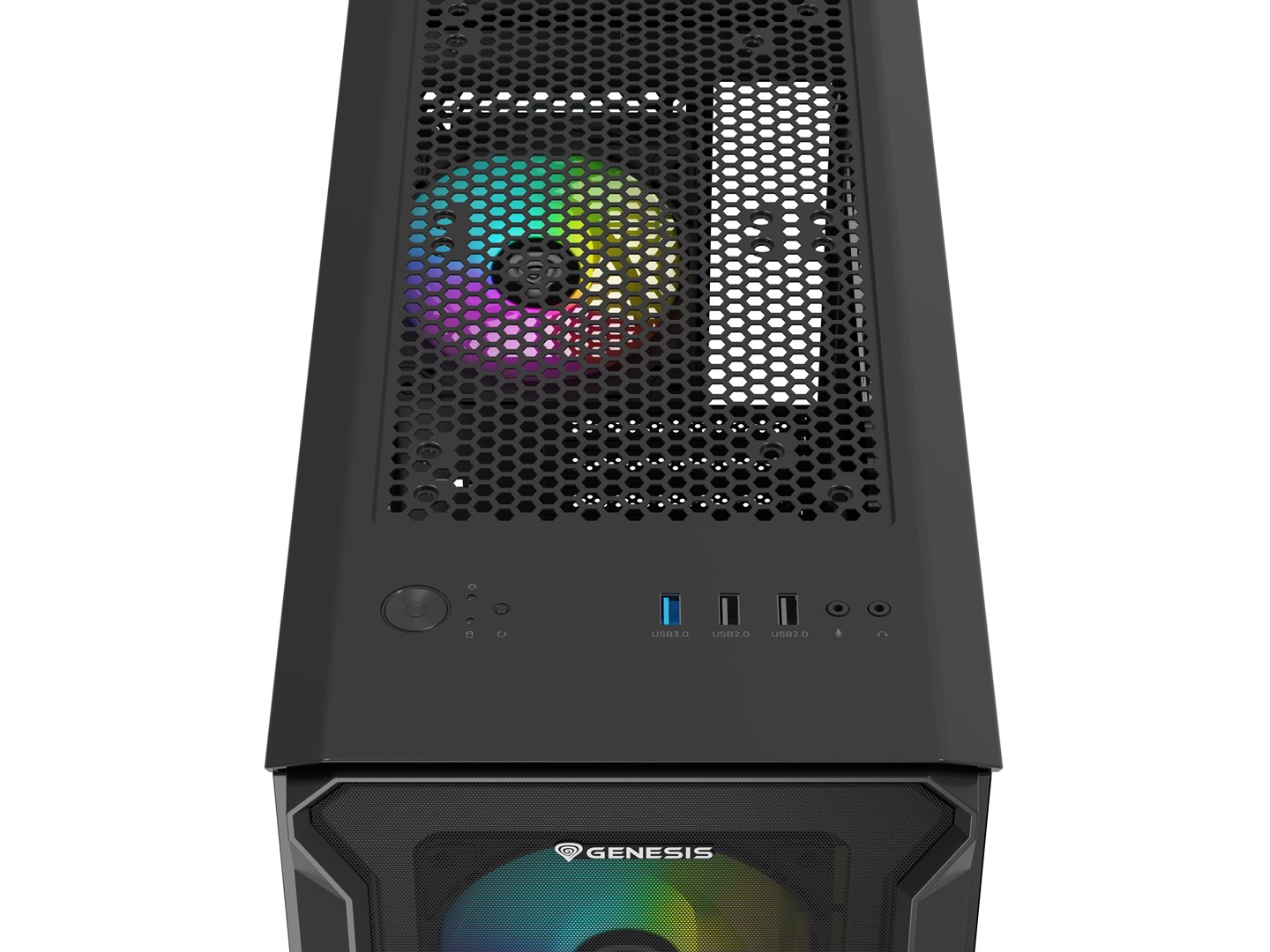 The top of the case comes with as many as three USB ports, including one USB 3.0 port. We have conveniently placed two jacks close to you, so that you can easily plug in your headphones and microphone. All this in addition to a button controlling the phenomenal ARGB lighting, so that you can set it to as you like it.
