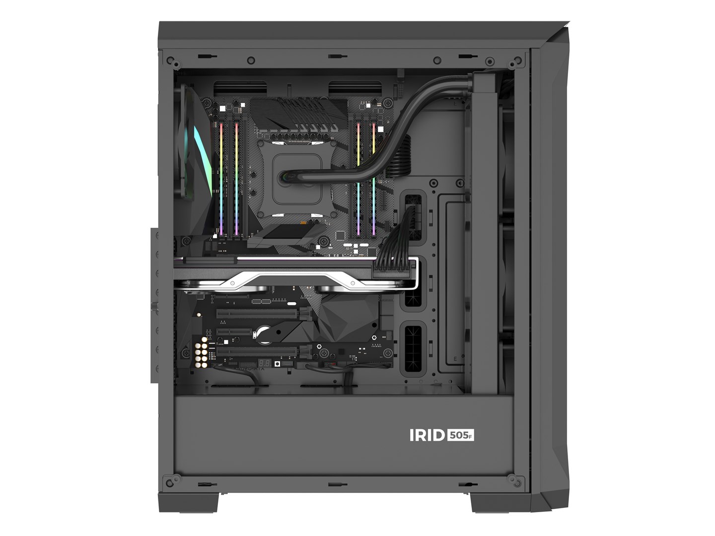 Choose Genesis Irid 505F and take advantage of the possibility of choosing your dream components and ventilation that will allow you to cool components even with a ~ 500 W of power. This is thanks to five Genesis Oxal 120 fans, a large amount of space around the graphics card, ability to mount standard air coolers with a maximum height of up to 165 mm, as well as the option to install efficient AIO water cooling systems.
