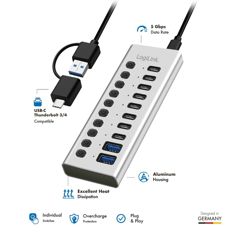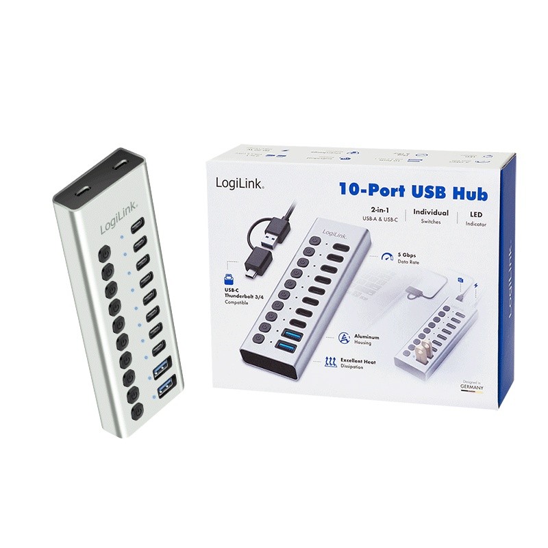 Expand the connectivity of your computer, laptop or tablet in no time at all. The LogiLink USB 3.2 Gen 1 hub offers a powerful solution for connecting multiple devices simultaneously and controlling them individually. Thanks to the innovative 2-in-1 connection cable, the hub can be used flexibly with both classic USB-A and modern USB-C interfaces. It is ideal for home offices to manage peripherals such as mice, keyboards and printers, as well as for creative professionals who need fast data transfers of up to 5 Gbit/s for external hard drives and USB sticks. It is also ideal for gamers to connect controllers or headsets and simply switch them off at the touch of a button when not in use. The high-quality aluminium housing and the included 20 W USB-C charger guarantee maximum stability and safety, even when multiple power-intensive devices are operated simultaneously.
