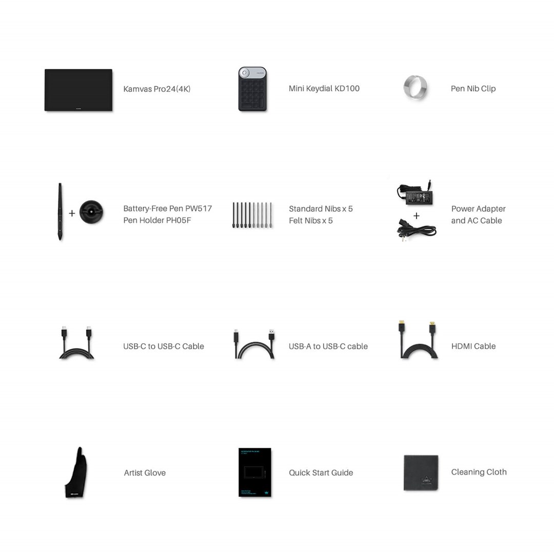 - Περιεχόμενα συσκευασίας: Mini πληκτρολόγιο KD100, καλώδια USB Type-A σε USB Type-C, καλώδια HDMI, καλώδια, καλώδιο τροφοδοσίας, καλώδια USB-C σε USB-C
