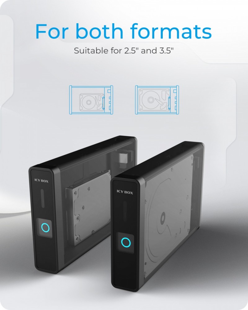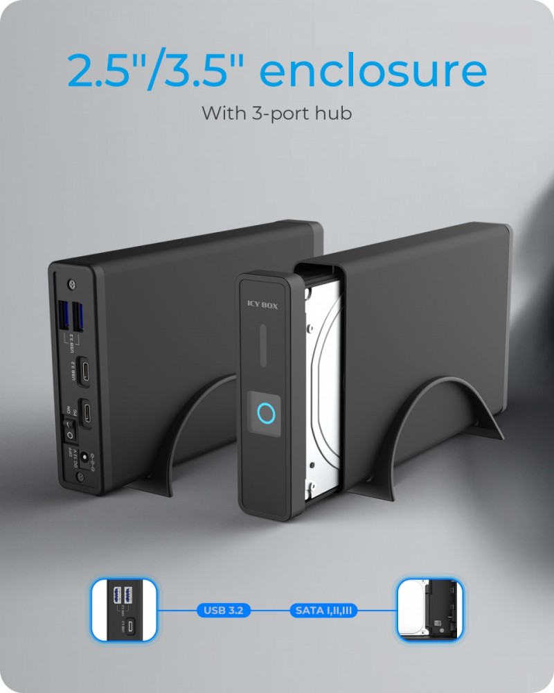 ICY BOX IB-382H-C31 USB Type-C enclosure with integrated USB Hub for 3.5″ & 2.5″ HDD/SSD Key features Type-C enclosure for 2.5″ or 3.5″ HDD/SSD Integrated hub with 1x USB Type-C, 2x USB Type-A All ports with USB 3.2 (Gen 2) with up to 10 Gbit/s SATA III up to 6 Gbit/s Plug & Play and HotSwap High-grade aluminium housing Dimensions: 90x130x230 mm Accessories included: 1 x power supply, 1x USB Type-C to Type-Ccable, 1x USB Type-C to Type-A cable, 1x screw set, 1x screwdriver, 1x stand, 1x manual