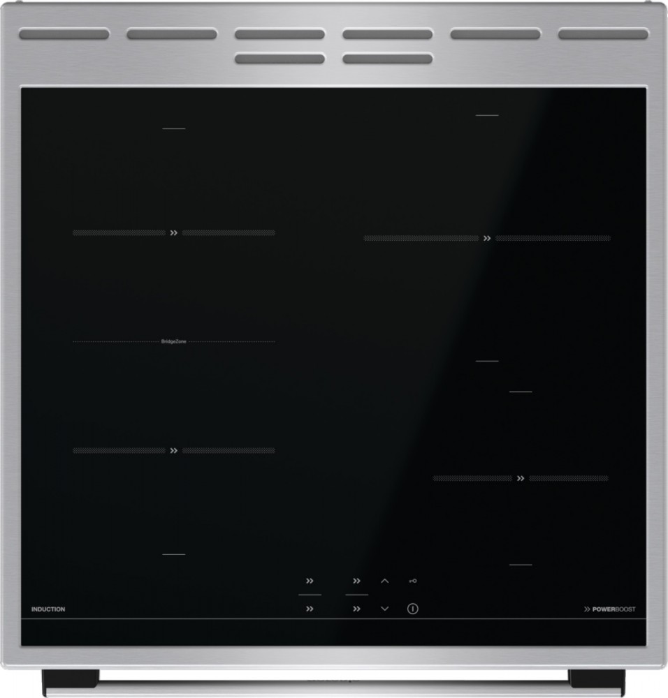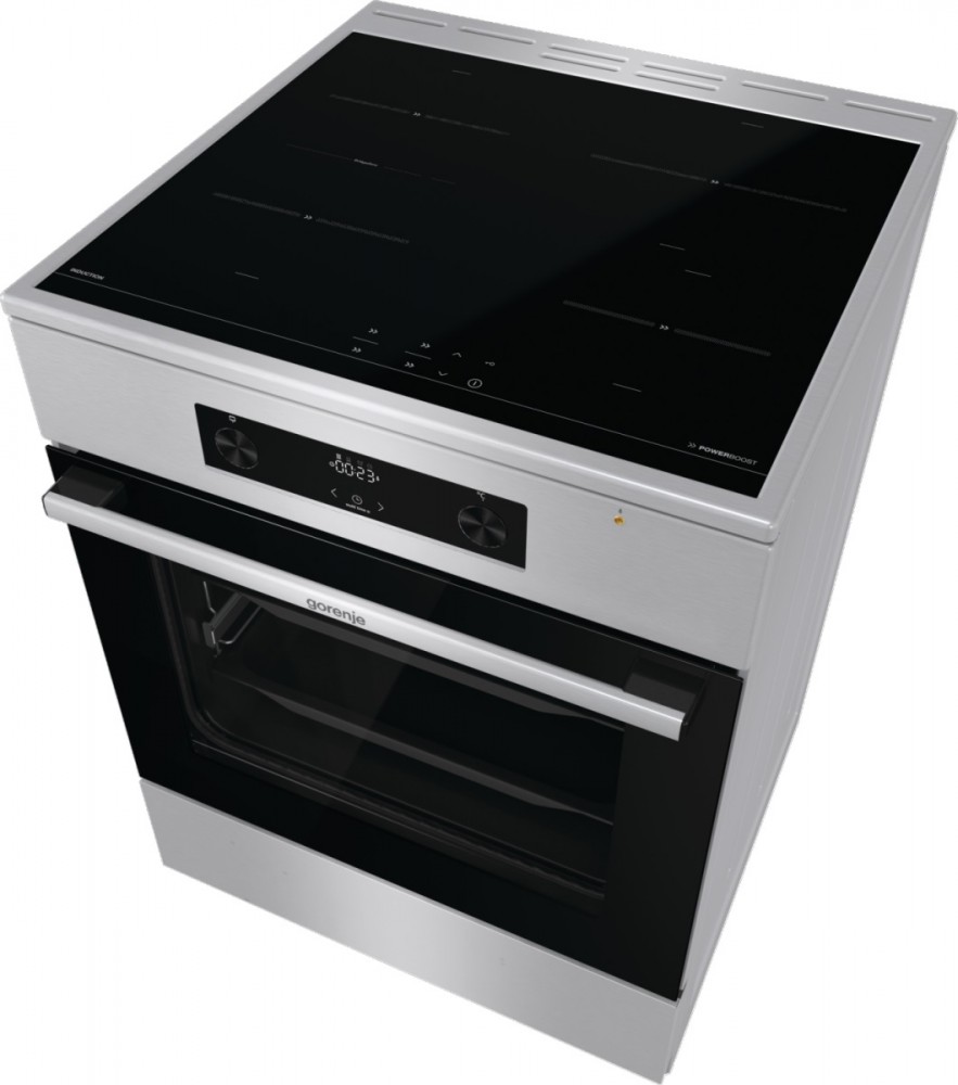 Description Induction cooker GEIT6C60XPG For healthy pleasures Now you can have the crispness and flavour of fried food without the extra calories. This method of extremely intensive hot air roasting requires no fat to ensure a perfectly delicious, crispy, golden crust. Combined with a special perforated roasting tray (depending on the model), which perfectly surrounds the food all around, you will achieve even better results. Suitable for small pieces of meat, fish, vegetables and ready-made frozen products such as Chips or chicken nuggets. Evenly cooked every time Gorenje ovens are well known for their innovative rounded cavity, which has been a feature of their ovens for many years. The HomeMade shape was inspired by traditional wood-fired ovens and provides better air circulation compared to the competition. Now, the HomeMade shape has been completely refreshed and the airflow has been improved with a new heater design and better positioning of the vents. This is why the temperature is stable throughout the oven. Never again will your food be burnt on one side and undercooked on the other. A simple plan for super-sized pots The induction hob with two combination zones simplifies cooking with large pots. Two separate cooking zones are combined into one with a simple touch. Perfect for cooking larger meals and side dishes at the same time. Kitchen as a safe environment The ChildLock option is the perfect solution for those who have children at home. Leaving them unsupervised in the kitchen has never been safer, as this option prevents them from resetting any parameters or changing the settings on the hob. Simple and effective defrosting Gorenje ovens are distinguished by an effective defrost function that will evenly defrost any deep-frozen product. Simply set the time and leave the rest to the oven! Just a gentle touch A gentle touch is all it takes to close the oven door smoothly and noiselessly. Fast and efficient cooking, simple cleaning Induction hobs heat up twice as fast as HiLight hobs, making them relatively more economical and safer. An induction hob heats only the bottom of the cookware, while the rest of the hob surface remains cool and always safe to touch. The temperature is regulated instantly by a simple touch, reducing the danger of overcooking. With this hob, melted chocolate, elaborate sauces and other temperature-sensitive masterpieces become a simple task. Accelerated cooking The PowerBoost function provides extreme heat intensity in the pot and significantly reduces cooking time. It now only takes around 5 minutes to boil 2 litres of water, which is extremely time-efficient. With PowerBoost, you therefore save time, energy and money. Ultra resistant, ultra smooth coating The quality and type of enamel are extremely important for the cooker and its performance. SilverMatte is a highly resistant and strong material that withstands extreme temperatures. Free of micropores, it coats the surfaces of oven cavities and baking trays, making them resistant to the highest temperatures. The interior coating helps to reflect heat and provides additional insulation. The oven interior therefore always remains sterile and safe. Everything within easy reach Most ovens include a convenient drawer with plenty of storage space for baking trays and other cooking accessories. Ready for XXL recipes Gorenje cookers offer an enlarged cooking surface and the use of extra-large baking trays. Innovative solutions enable optimum energy consumption and even cooking of food, regardless of the quantity. The full width of the oven is used efficiently and superior technology ensures that food is cooked evenly on all levels. Simple and easy control State-of-the-art sensor technology enables clear and simple touch control. The control surface is perfectly smooth and easy to clean.