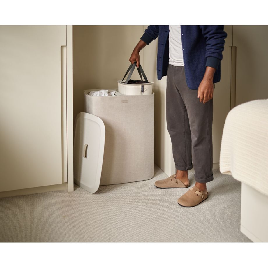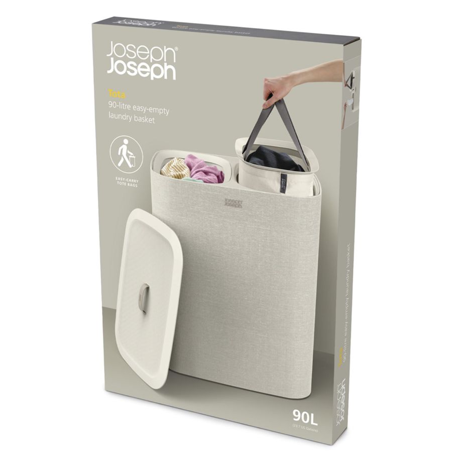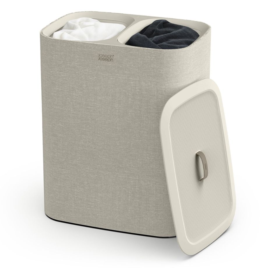 Καλάθι απλύτων με διπλά διαμερίσματα για εύκολη διαχωρισμό των ρούχων. Περιλαμβάνει αφαιρούμενους σακούλες μεταφοράς με εύχρηστες λαβές. Η βοήθεια στη βάση των σακουλών διευκολύνει την αδειά τους. Ιδανικό για δωμάτια, μπάνια ή χώρους υπηρεσίας.