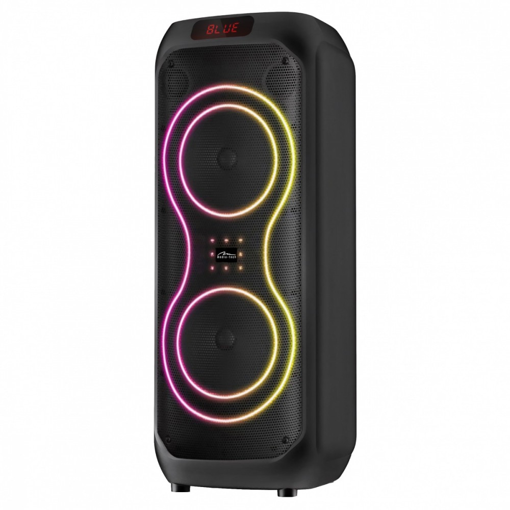 Media-Tech POWER AUDIO MAX MT3185 is a powerful, mobile audio system with 120W RMS power, designed specifically for parties and karaoke. Equipped with two 8-inch speakers, it offers dynamic sound and modern connectivity features within a rugged housing.