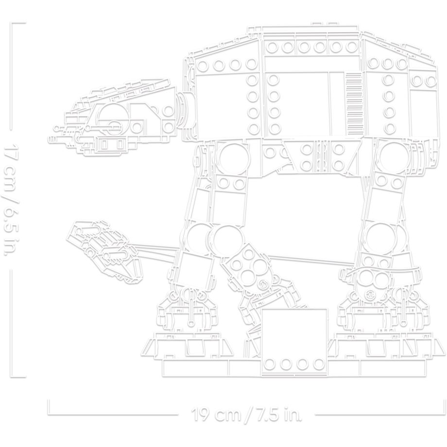- DIMENSIONS The AT-AT in this 525-piece set measures over 17 cm (6.5 in.) high, 19 cm (7.5 in.) long and 11 cm (4.5 in.) wide and makes an eye-catching desk decoration