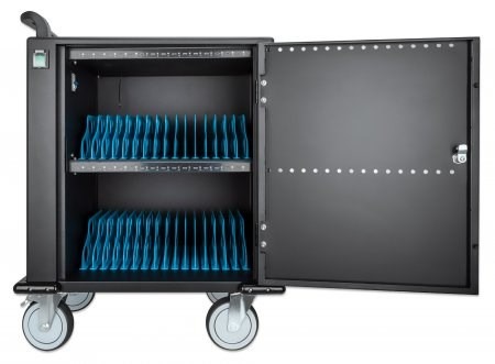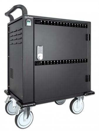 Manhattan iPad to 13 MacBook Air to 13 & Chromebook to 14 32-bay Charging Trolley/Cart via USB-C Also other tablets/smartphones (with device to USB-C cable) Bays 330x22x235mm Device charging cables not included (suggest USB-C cable 354868) Cab
