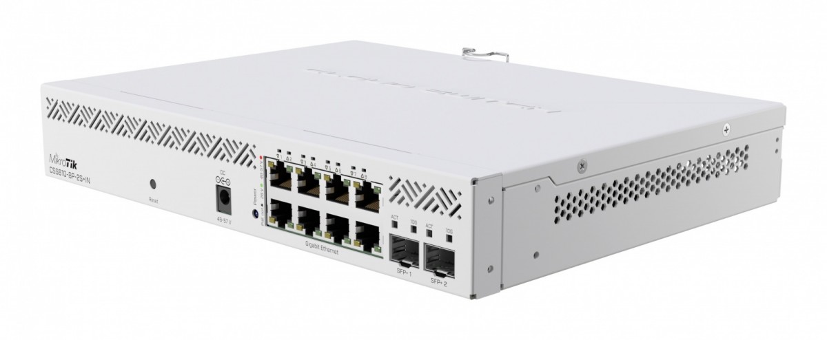 There are two SFP+ ports for 10-gigabit fiber connectivity and eight Gigabit Ethernet ports with support for 802.3af/at and passive PoE output (one power supply is enough to provide both).