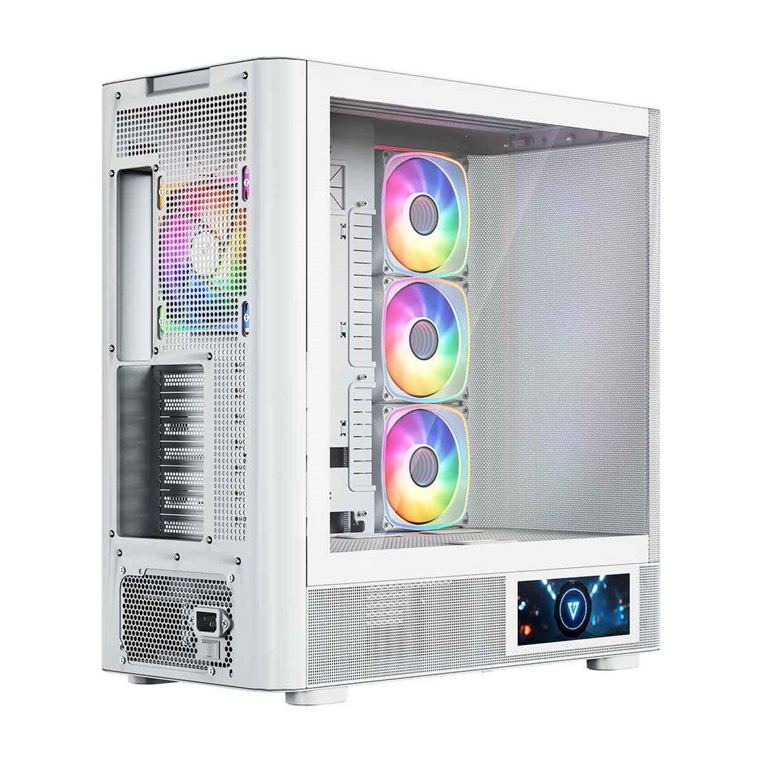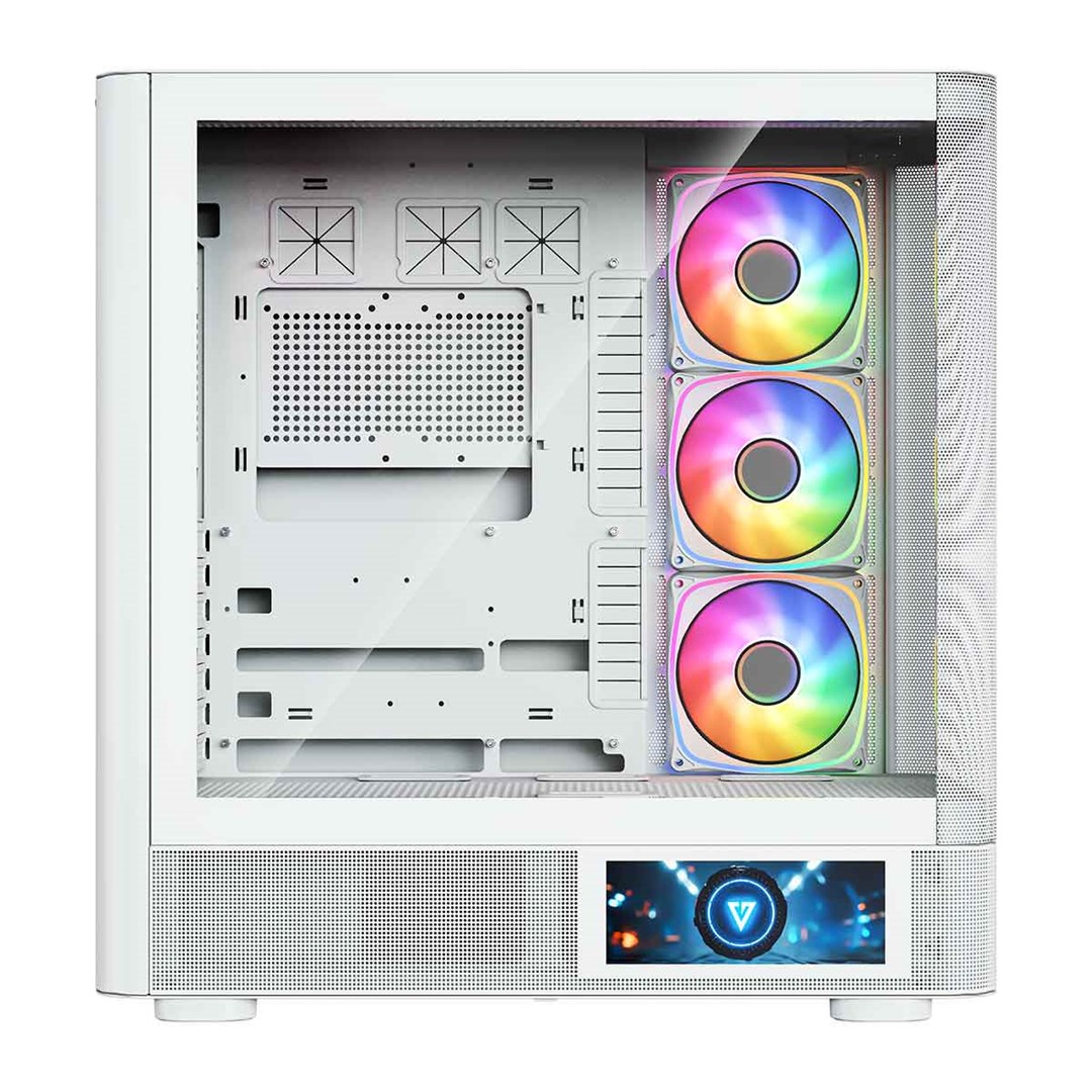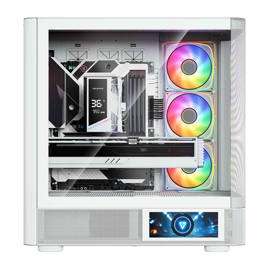 Description PC case Volcano AQ400 ARGB MIDI WHITE The MODECOM Volcano AQ400 ARGB MIDI is a representative of the Volcano AQ case series, characterized by an eye-catching design with rounded shapes of the front panel (in this case, a perforated metal panel), support for installing motherboards with reversed connectors, four 120 mm ARGB fans included as standard with an ARGB lighting controller, and support for water-cooling radiators up to 420 mm, as well as numerous perforations on the side panels to ensure efficient cooling performance. A distinctive feature of the AQ400 version is the LCD screen located on the side of the case, which allows users to display images, play videos in MP4 format, or monitor temperatures and workload of the processor, graphics card, and RAM usage.All these features are complemented by two USB 3.0 ports and one USB-C port (USB 3.2 Gen 2). This is a case designed to showcase components and personalize the computer to your own style.