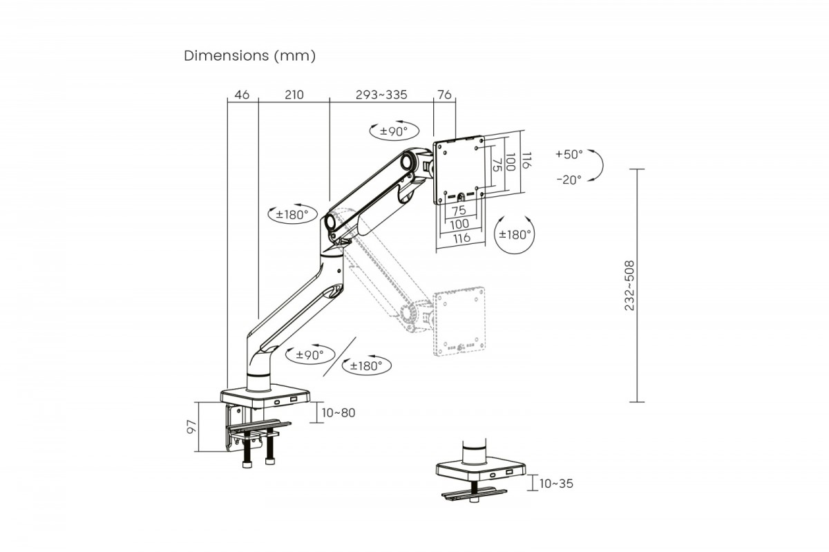 Other features: Mechanical Spring with Tension Adjustment Monitor Tilt: 70° (from +50° to -20°) Monitor Swivel: 180° (from +90° to -90°) Monitor Rotation: 360° (+180° to -180°) Quick Connector Joining Two Arms for Fast and Easy Installation Full Arm Extension: 54.5 cm Integrated Cable Management