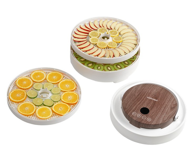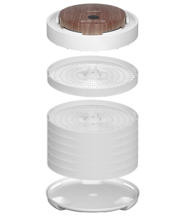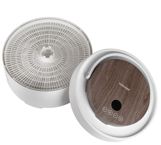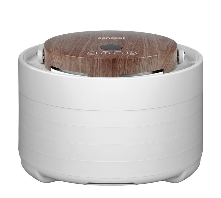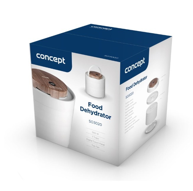 Innovative Design with Motor in the Lid The Concept SO3020 food dehydrator impresses with its modern design, featuring a lid with an elegant wood finish and a practical handle for easy handling. It offers 7 drying trays and an intelligent design solution, with the motor located directly in the lid. This placement protects it from damage caused by dripping juice or food particles that may fall during drying. Its stylish appearance combined with practical details makes the dehydrator not only functional but also an aesthetically pleasing appliance in any kitchen. Even Drying During drying, hot air flows through the openings in each tray from top to bottom and is distributed throughout the interior of the dehydrator by the fan. This ensures the SO3020 model provides even drying on all levels. Healthy Food Preservation Year-Round Drying is one of the gentlest methods of food preservation, retaining valuable vitamins and minerals. It is also a year-round method that allows you to easily process fruits, vegetables, mushrooms, herbs, flowers, or pasta. The dehydrator also helps prepare tasty treats for pets and RAW dishes that are not exposed to temperatures above 42 °C. Intuitive Touch Control with Temperature and Time Settings The SO3020 dehydrator features intuitive digital touch controls with a clear display. It allows easy setting of the temperature from 35 to 70 °C and selection of drying time via the timer. At the end of the process, an audible signal sounds, and the dehydrator automatically turns off. Sieves / trays: 7 Power: 5 Strainer diameter: 3 Dimensions: 33 x 34 x 34 cm Other features: Adjustable drying temperature: 35-70°C (in 1°C increments) Timer: 10minutes – 48hours (in 10minute increments) Noise level: