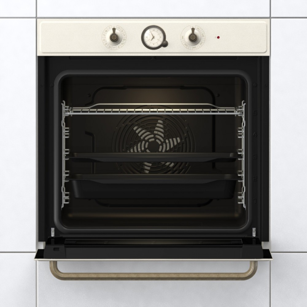 Description Oven BOS67371CLI AirFry For healthy enjoyment Now you can have the crispness and deliciousness of fried food without the extra calories. This extremely intensive hot air baking method requires no fat to ensure a perfectly delicious, crispy golden crust. Combined with a special perforated baking tray (depending on the model) that perfectly wraps the dish around you, you will achieve even better results. It is ideal for small pieces of meat, fish, vegetables and frozen ready meals such as Chips and chicken nuggets. You will enjoy the wonderfully crispy golden crust of your favourite fried foods, but without a drop of oil! You will always be able to accommodate all the dishes you want to bake Ready for XXL recipes? Gorenje's innovative BigSpace design means the interior is larger and the width of the oven is fully utilised. There is more space on each baking tray and superior technology ensures that food cooks evenly on all levels. Efficient heat management The DynamiCooling system effectively cools the outer surface of the oven (or housing) to prevent heat damage. In ovens with the DynamiCooling + system, heat sensors regulate the cooling of the outer oven walls until they reach a temperature of 60°C. This is particularly convenient in ovens with the pyrolytic cleaning function, which operates at extremely high temperatures. Simple steaming This programme creates the ideal steaming conditions for bread to have a high rise and crispy crust. Simply pour some water into the shallow tray, select the ExtraSteam programme and let the oven do all the work. Created for spontaneous inspiration Gorenje's OptiBake ovens reach temperatures of up to 200 C in just 5 minutes, saving 30% of the time needed for standard preheating and making them one of the fastest ovens on the market. This is very convenient for recipes that require a preheated oven. A light and sound signal lets you know the correct temperature. The fastest way to bake frozen products Gorenje's FrozenBake is an efficient baking programme, the ideal choice for all frozen foods and ready meals. For very tender and juicy food This function involves gentle, slow and even baking. In this way, the moisture is locked in and the dishes remain super tender and juicy. A function created for cooking meat, fish or cakes on one level. Evenly cooked every time Gorenje ovens are well known for their innovative rounded cavity, which has been their signature feature for many years. The HomeMade shape was inspired by traditional wood-fired ovens and provides better air circulation compared to the competition. Now, the shape of the HomeMade has been completely renewed and the airflow has been improved with a new heater design and improved vent placement. This ensures stable temperatures throughout the oven. Your dishes will never again be burnt on one side and undercooked on the other. The double preheater ensures evenly crispy dishes The best cooking results are achieved with a combination of larger and smaller heaters. The intelligent arrangement of the heaters enables optimum heat distribution and ensures the best cooking results every time. This ensures that your dishes are always crispy on the outside and soft on the inside. The best pizza in town Gorenje's Pizza programme with a baking temperature setting of up to 300o C has been specially designed to help you bake the perfect pizza, focaccia, scones and similar baked goods. All pizza fans will be in culinary paradise! Easy access, easy cleaning The oven glazing can be easily removed, ensuring easier cleaning and therefore always a perfect view of the oven.