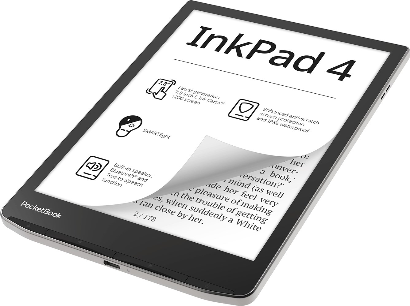 Το Ebook Reader InkPad 4 της εταιρείας Pocketbook έχει αποθηκευτικό χώρο 32GB, κάτι που σημαίνει ότι μπορείτε να αποθηκεύσετε ως και 24000 eBooks. Διαθέτει οθόνη αφής 7.8″. Συνδεθείτε σε όποιο Wifi δίκτυο επιθυμείτε για να ανακαλύψετε νέα eBooks και να τα κατεβάσετε στη συσκευή σας. Το διαθέσιμο bluetooth σας επιτρέπει να συνδέσετε το eBook με ασύρματα ηχεία ή ακουστικά, για την ακρόαση audible eBooks στο σπίτι ή το ταξίδι σας.