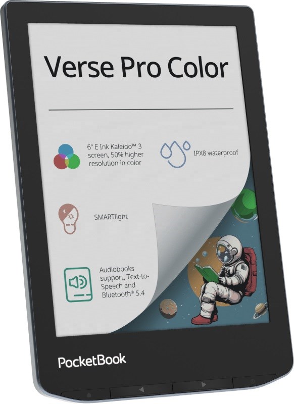 Το Ebook Reader Verse Pro Color της εταιρείας Pocketbook έχει αποθηκευτικό χώρο 16GB, κάτι που σημαίνει ότι μπορείτε να αποθηκεύσετε ως και 12000 eBooks. Διαθέτει οθόνη αφής 6″. Συνδεθείτε σε όποιο Wifi δίκτυο επιθυμείτε για να ανακαλύψετε νέα eBooks και να τα κατεβάσετε στη συσκευή σας. Το διαθέσιμο bluetooth σας επιτρέπει να συνδέσετε το eBook με ασύρματα ηχεία ή ακουστικά, για την ακρόαση audible eBooks στο σπίτι ή το ταξίδι σας.