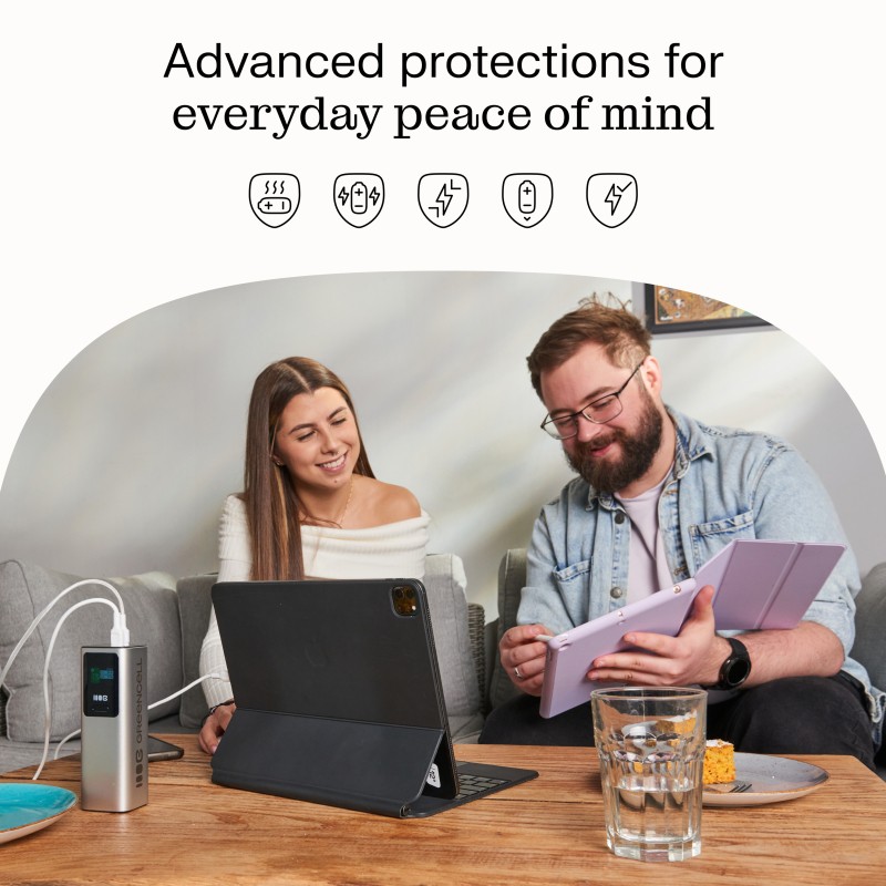 - Overheat protection: Built-in temperature sensors automatically detect when the device starts to overheat. The powerbank then regulates charging power itself, protecting against damage.