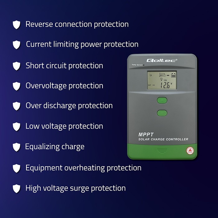 Smart Solar Energy Management The controller uses MPPT technology, which maximizes energy efficiency by enabling optimal utilization of solar power . It continuously monitors and adjusts the voltage and current from the photovoltaic panels to ensure maximum power point tracking. This advanced energy management allows for the highest possible efficiency from solar panels , even under varying weather conditions such as partial shading or changes in sunlight intensity. Adjust the system to your needs The charge controller is an essential component in photovoltaic systems on boats and RVs. The solar system provides independence from stationary power sources, allowing the use of energy in places where access to the grid is limited or non-existent . The controller ensures not only efficient battery charging and maximum performance of the solar panels but also protection against various hazards such as excessive discharge, overload, and reverse connection . This ensures that solar systems operate reliably, delivering the necessary power both on the water and during road trips. With full compatibility with lithium-iron-phosphate technology, it guarantees precise and safe charging, maximizing battery life. Intelligent system management The intuitive interface allows you to quickly navigate through the settings and easily adjust parameters to suit your needs. Easy setup and operation with a user-friendly menu Remote monitoring via mobile app Battery protection from overheating and overcharging thanks to the external temperature sensor Instant alerts for errors and warnings Optimal Performance through Advanced Monitoring The product features an advanced LCD display and integrated Bluetooth, providing users with complete control and clear visibility of system operation. The intuitive display menu simplifies configuration and allows for easy customization of settings to suit individual preferences . The screen displays real-time operating parameters, enabling continuous performance monitoring. With an external temperature sensor and Bluetooth connectivity, you can remotely monitor the system's status via a mobile app, while also protecting the battery from overcharging or overheating . Users can quickly check the current operating status and receive notifications about any errors or alarms. Your safety is our priority advanced security technologies The product is equipped with a number of safety features to ensure safe and reliable use: Short-circuit protection : Automatically disconnects the system when a short circuit is detected, protecting the equipment and installation Battery over-discharge protection : disconnects the load when the voltage drops below a safe level Overheating protection : is equipped with a temperature sensor that monitors the temperature of the unit, when the temperature exceeds the safe level, the controller can reduce the charging capacity or shut down the system completely until it cools down Overload protection : automatically disconnects the load when it detects that the current exceeds the safe limits Solar panel reverse connection protection : The regulator is equipped with a polarity detection circuit that checks that the solar panel wires are connected correctly Battery reverse connection protection : The regulator blocks the flow of current, preventing damage to the battery and regulator. Accessories included: MPPT Controller User Manual Warranty card