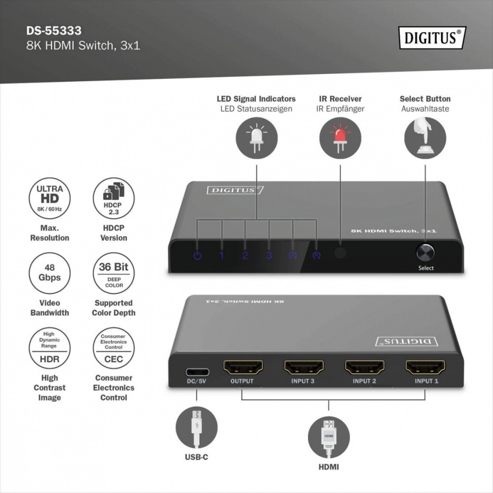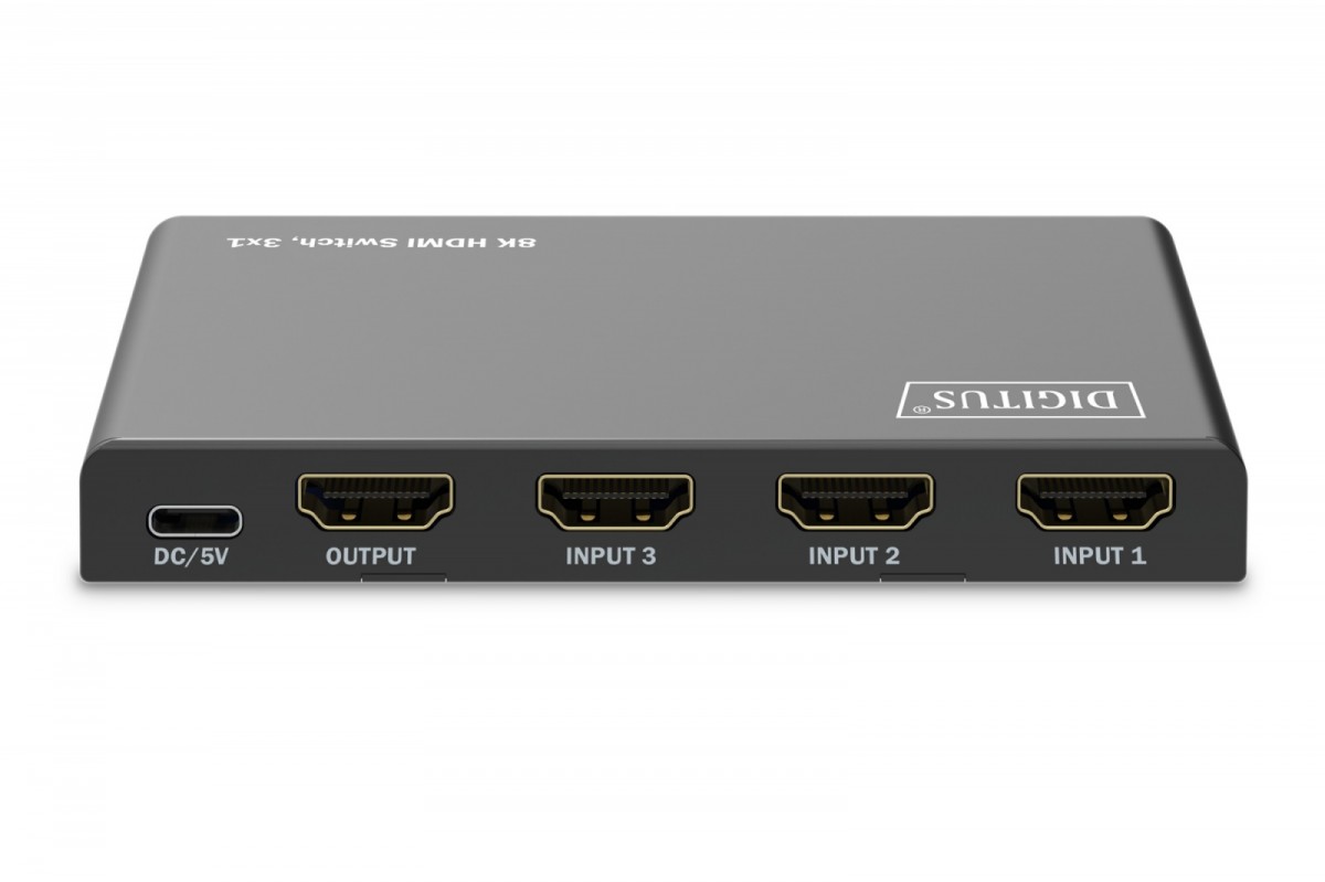The DIGITUS 8K HDMI switch type 3 x 1 offers additional HDMI ports for connecting displays – you can display 3 signal sources with only 1 HDMI port. The video switch is powered via a USB-C cable, e.g. via the source device or USB power supply. It is possible to conveniently switch between signal sources using the remote control or via automatic detection. Ideal for mounting your TV on the wall – all you need is an HDMI cable to connect the signal sources.