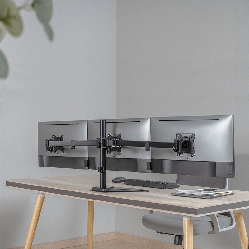 Our durable and versatile monitor holder for three screens is designed to optimize your workspace, it securely holds three monitors, reducing clutter and increasing productivity. Easily adjust the height, tilt, and rotation for a customized viewing experience. The sturdy construction ensures stability, while the sleek design adds a modern touch to your desk. Say goodbye to neck strain and hello to effortless multitasking. Upgrade your setup with our monitor holder for three monitors.