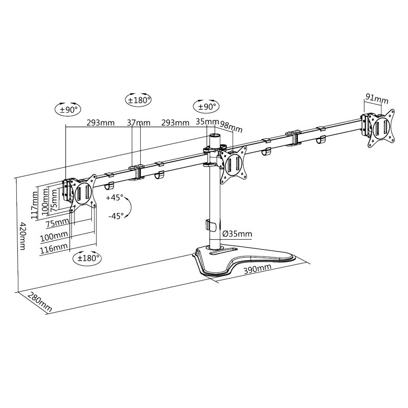 Other features: Mounting type: Free-standing with integrated smartphone holder in the base plate Weight capacity: 7 kg max. each arm Dimensions front panel WxH: 116×117 mm Pole height: 420 mm, pole diameter: 35 mm Dimensions base plate WxD: 390×280 mm Cable management: Elegantly hides all cables connected to the monitor