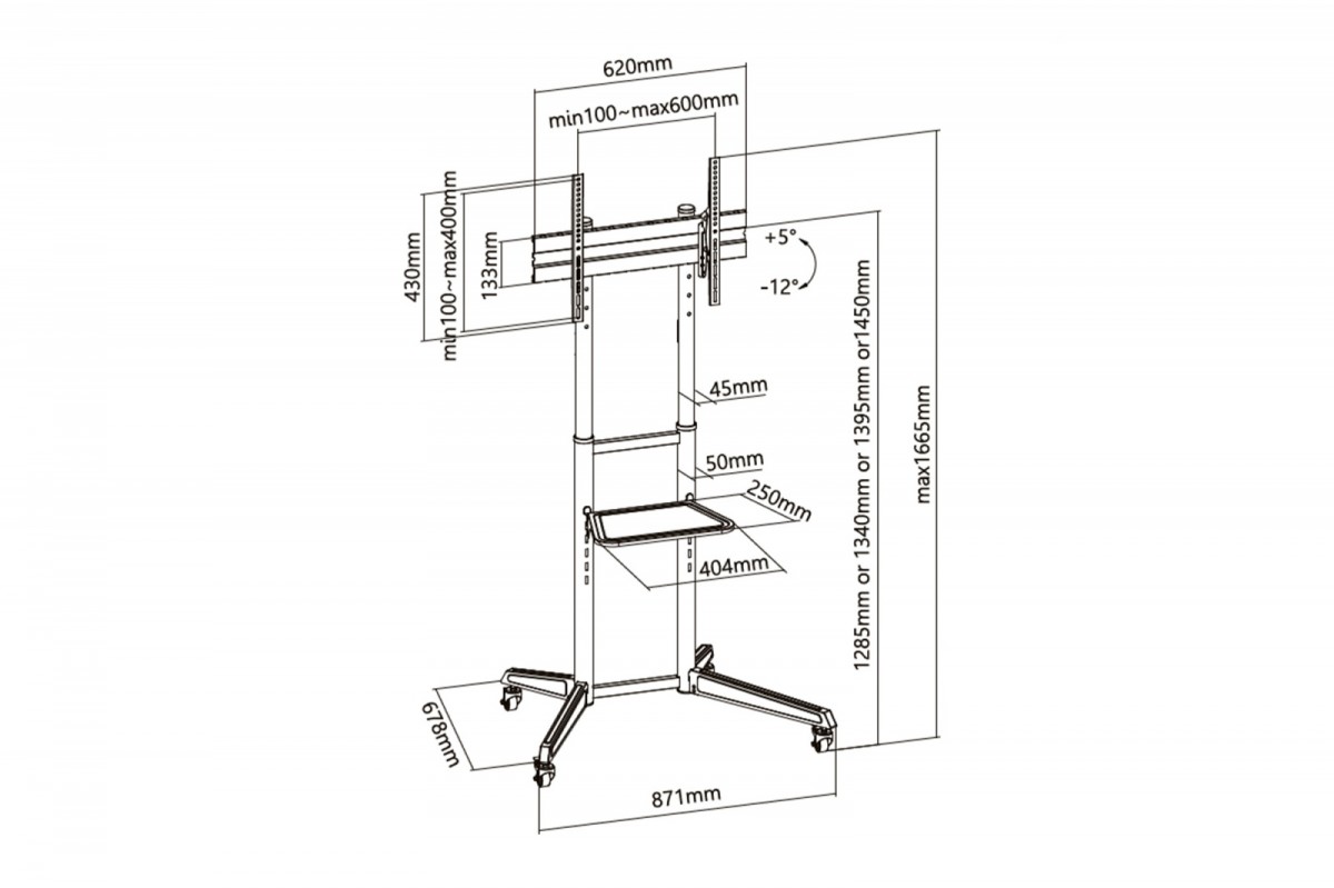 It is suitable for televisions with a screen diagonal of 37''- 70'' with a weight of up to 50 kg and can be used in various locations such as offices, conference rooms, restaurants, hospitals, etc. Four possible height settings for the mounting plate allow adjustment to the desired height. The tool-free tilt adjustment provides the optimum angle for viewing the screen. Thanks to the (two) castors with locking function in position, the TV trolley can be easily moved and stopped as required. The integrated cable management solution ensures a tidy appearance. Notepad, player etc. can be placed on the practical shelf.