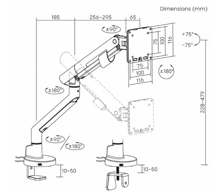 - Vertical adjustment (tilt): -75 to 75 degrees