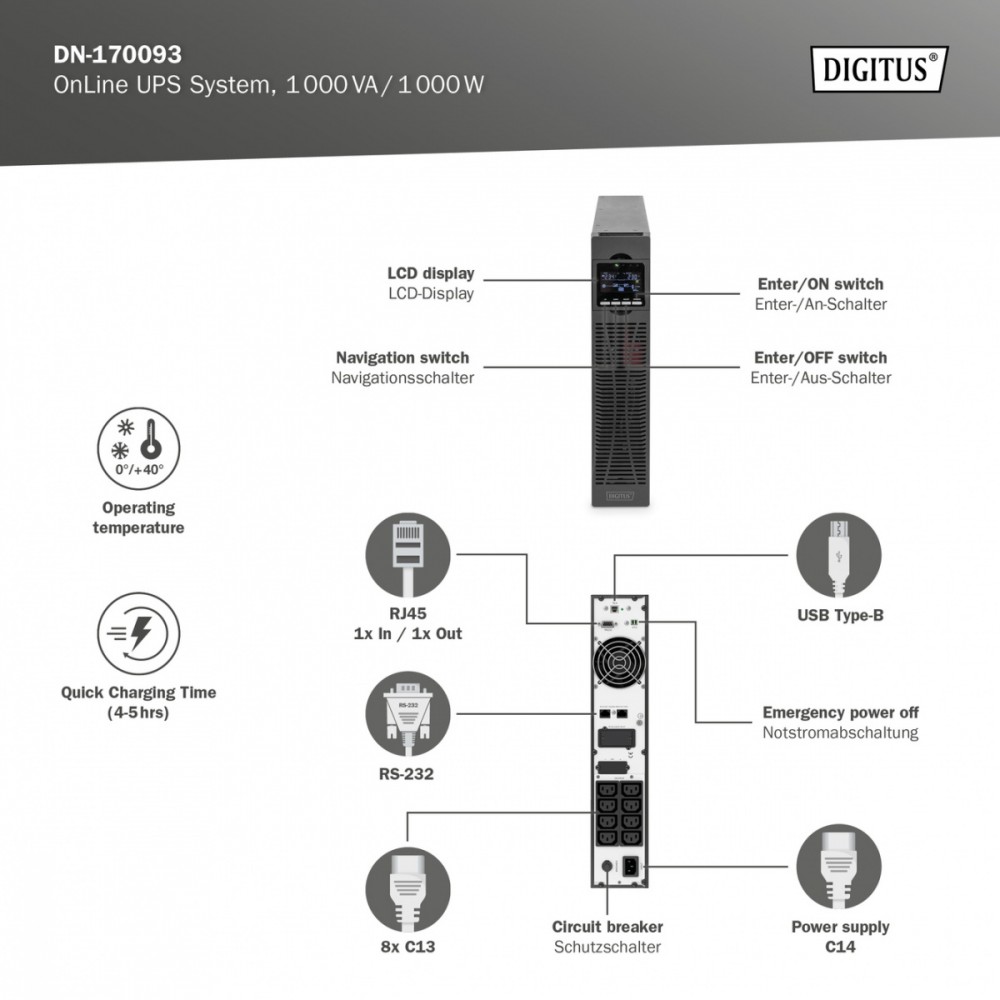 Τα συστήματα DIGITUS OnLine UPS είναι εξαιρετικά αξιόπιστες λύσεις που έχουν σχεδιαστεί για να προστατεύουν ευαίσθητο εξοπλισμό από διακοπές ρεύματος. Είναι εξοπλισμένα με μικροεπεξεργαστές ελέγχου για να εγγυώνται την υψηλότερη απόδοση και ασφάλεια των επαγγελματικών και γραφειακών συστημάτων του χρήστη, καθώς και προστασία από απώλεια δεδομένων και πιθανές ζημιές. Με τον υψηλό συντελεστή ισχύος, το ευρύ φάσμα τάσης και τον ισχυρό φορτιστή, το σύστημα είναι επίσης κατάλληλο για απαιτητικές εφαρμογές. Οι έξυπνες λειτουργίες φόρτισης και ο έλεγχος ταχύτητας ανεμιστήρα παρατείνουν τη διάρκεια ζωής και αυξάνουν την αξιοπιστία του UPS. Χρησιμοποιώντας την οθόνη LCD, όλες οι ρυθμίσεις παραμέτρων αυτού του UPS μπορούν να διαμορφωθούν για αδιάλειπτη παροχή ρεύματος. Ένας προσαρμογέας SNMP για απομακρυσμένη πρόσβαση στο σύστημα UPS διατίθεται προαιρετικά.