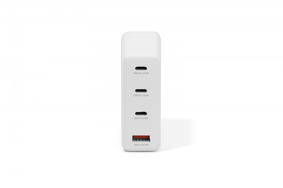 The 140W GaN II charger with a sturdy holder and four ports is the ideal solution for modern workstations with high power requirements. Equipped with three USB-C ports (140W, 100W, and 65W max) and one USB-A port (22.5W max), it allows you to simultaneously charge your laptop, tablet, smartphone, and other devices. Combined power output is up to 130W in dual-port mode, up to 115W in three-port mode, and up to 110W when all ports are fully used. Whether in the office, home office, coworking space, or university, the 140W USB charger is the perfect solution for charging multiple devices simultaneously, safely and efficiently in a professional environment. Even two notebooks are no problem. The practical stand allows you to place the charger on your desk to save space. Modern GaN II (gallium nitride) technology ensures high efficiency, a compact design, and reliable charging. Made from 30% PCR (post-consumer recycled) materials and packaged 100% plastic-free, the device combines technological efficiency with sustainability.