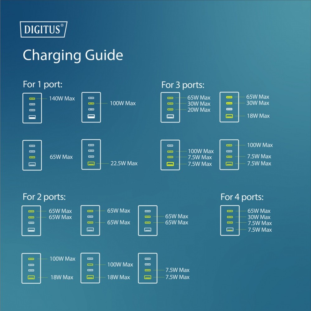 Other features: Maximum power output per connection: USB-C1 max 140W, USB-C2 max 100W, USB-C3 max 65W, USB-A max 22.5W Multiple device charging (2 ports) USB-C1/C2 + USB-C2/C3: 65W max for each. Multi-Device Charging (2 Ports) USB-C1/USB-C2 + USB-A: 100W + 18W max. Multi-Device Charging (3 Ports) USB-C3 + USB-A: 7.5W + 7.5W max. Multi-Device Charging (3 Ports) USB-C1 + USB-C2 + USB-C3: 65W + 30W + 20W max. Multi-Device Charging (3 Ports) USB-C1 + USB-C2 + USB-A: 65W + 30W + 18W max. Multi-Device Charging (3 Ports) USB-C1 + USB-C3 + USB-A: 100W + 7.5W + 7.5W max. Multi-Device Charging (3 Ports) USB-C2 + USB-C3 + USB-A: 100W + 7.5W + 7.5W Max. Multi-device charging (4 ports) USB-C1 + USB-C2 + USB-C3 + USB-A: 65W + 30W + 7.5W + 7.5W max. GaN II (Gallium Nitride) technology for high efficiency, low heat generation, and a compact design Input voltage/rated current/frequency: 100-240V / 2.5A / 50/60Hz Average active efficiency: 84.70% Standby power consumption: 0.29W