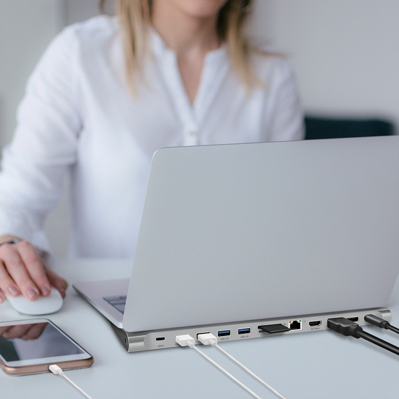 Other features: Supports connection of up to 11 devices via a single USB-C cable Video output resolution: HDMI 1: 3840×2160 @ 60 Hz HDMI 2: 3840×2160 @ 30 Hz DisplayPort: 1920×1080 @ 60 Hz Supports DisplayPort Alt Mode Supports MST (Multi-Stream Transport) on Windows and macOS Display modes: extended, mirror, primary Video standards: HDMI 2.0, DisplayPort 1.0, HDCP 1.42.3 Video features: HDR, 3D, DSC, HFR, EDID pass-through Supported color formats: RGB, YCbCr 4:4:4 / 4:2:2 / 4:2:0 Color depth: 8-bit and 10-bit Audio support: LPCM 2.0 / 5.1 / 7.1, DTS, Dolby Digital, DTS-HD Master Audio, Dolby TrueHD Network: Standards: IEEE 802.3 / 802.3u / 802.3ab / 802.3az Speed: 10 / 100 / 1000 Mbps Card reader: SD / SDHC / SDXC microSD / microSDHC / microSDXC Max capacity: up to 2 TB Plug & Play: yes (MST may require drivers on Windows and macOS)